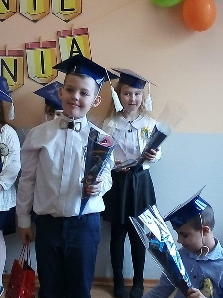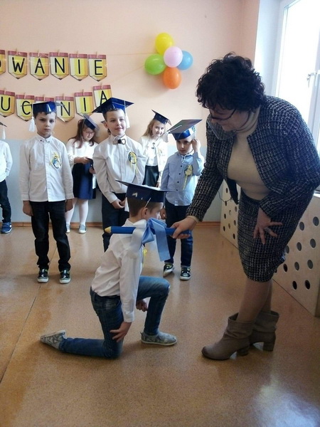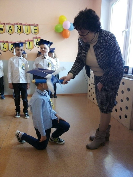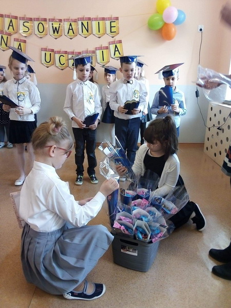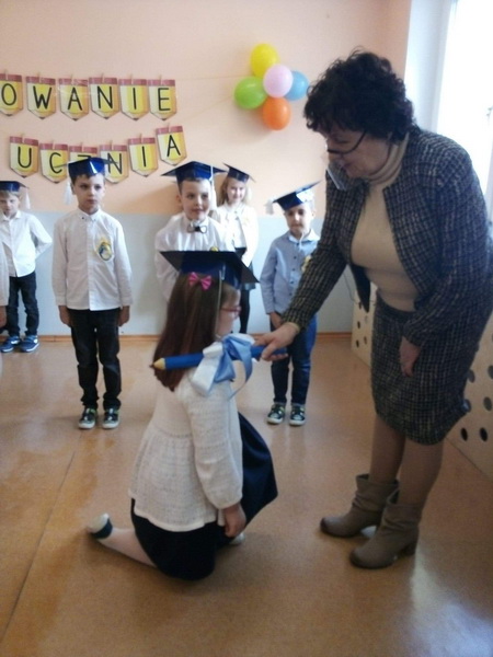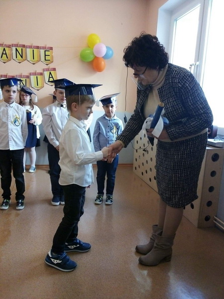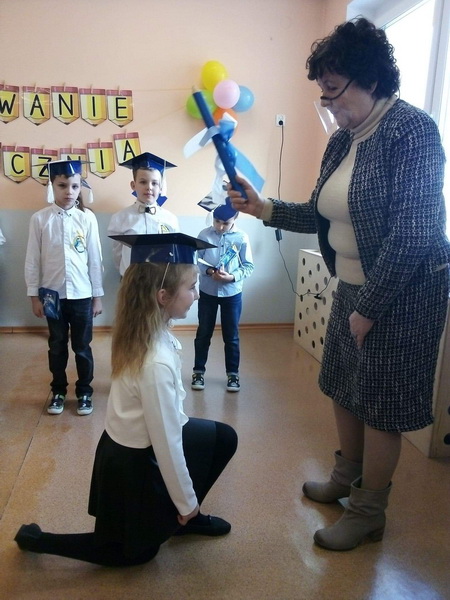 Pani Dyrektor Anna Wilczura poprzez dotknięcie ogromnym, zaczarowanym ołówkiem ramienia każdego dziecka zamieniała go w prawdziwego ucznia. Na koniec uczniowie otrzymali pamiątkowe dyplomy i upominek.