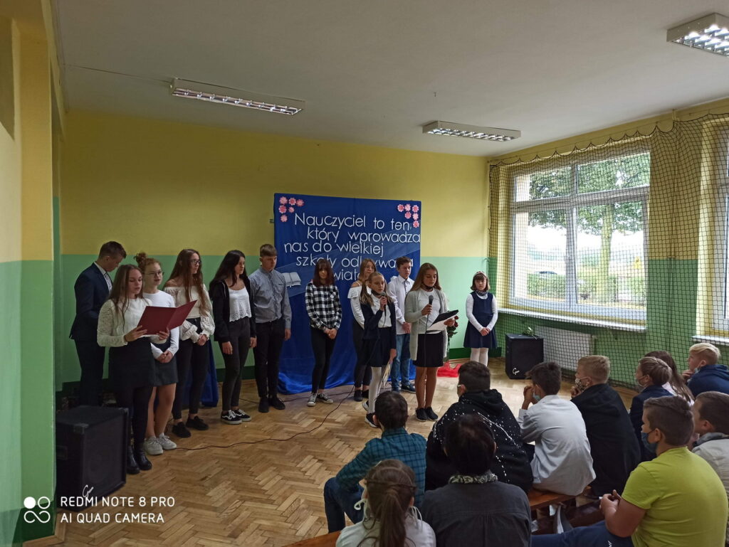 Dzień Edukacji Narodowej jest okazją do wyrażenia wdzięczności za wysiłek włożony w wychowanie i wielkie serce wkładane na rzecz pracy z dziećmi. W tym dniu nasi uczniowie pamiętali o wszystkich pracownikach szkoły. We wtorek 13 października odbył się uroczysty apel, który przygotował Samorząd Uczniowski pod kierunkiem opiekuna SU – Grzegorza Ziętka. Uczniowie pieśnią i słowem uświetnili ten wyjątkowy dzień w roku. Wiele ciepłych i miłych słów popłynęło w kierunku naszych nauczycieli. Podczas apelu złożono życzenia i podziękowano za pracę wszystkim nauczycielom, wychowawcom oraz pracownikom administracji i obsługi.