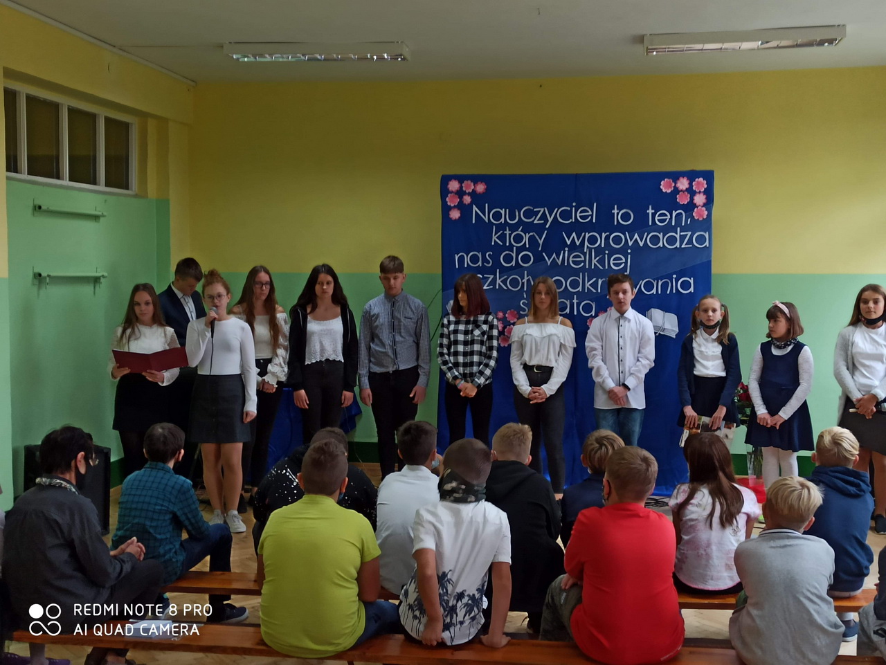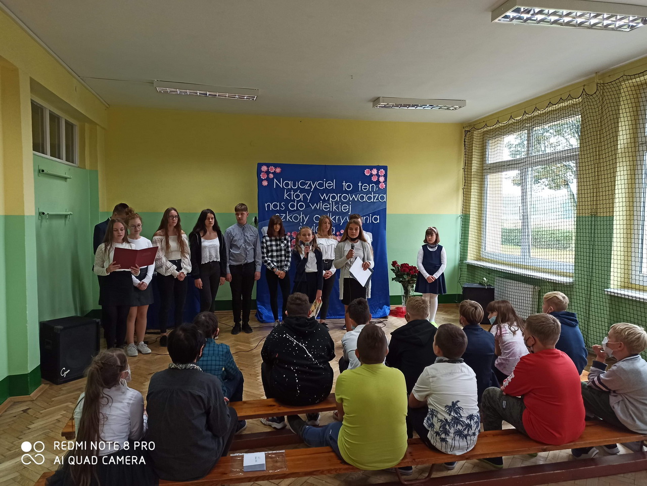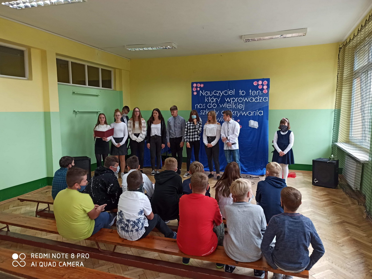 Dzień Edukacji Narodowej jest okazją do wyrażenia wdzięczności za wysiłek włożony w wychowanie i wielkie serce wkładane na rzecz pracy z dziećmi. W tym dniu nasi uczniowie pamiętali o wszystkich pracownikach szkoły. We wtorek 13 października odbył się uroczysty apel, który przygotował Samorząd Uczniowski pod kierunkiem opiekuna SU – Grzegorza Ziętka. Uczniowie pieśnią i słowem uświetnili ten wyjątkowy dzień w roku. Wiele ciepłych i miłych słów popłynęło w kierunku naszych nauczycieli. Podczas apelu złożono życzenia i podziękowano za pracę wszystkim nauczycielom, wychowawcom oraz pracownikom administracji i obsługi.