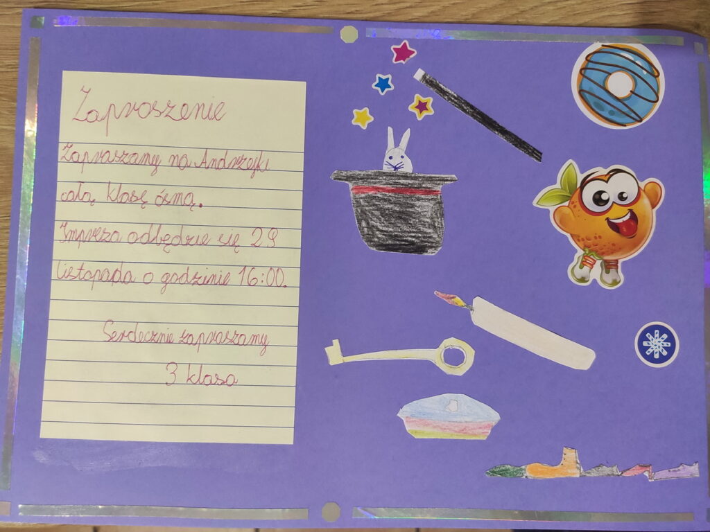 Tradycja organizowania zabaw ANDRZEJKOWYCH w naszej szkole kontynuowana jest od wielu lat. W tym roku mimo nauki zdalnej też znaleźliśmy sposób, aby się do nich przygotować. Uczniowie klas 1-3 podczas zajęć wykonali zaproszenia i plakaty, które miały zachęcić dzieci do zabaw zarówno online na zajęciach, jak i swoich domach, w gronie najbliższych.
