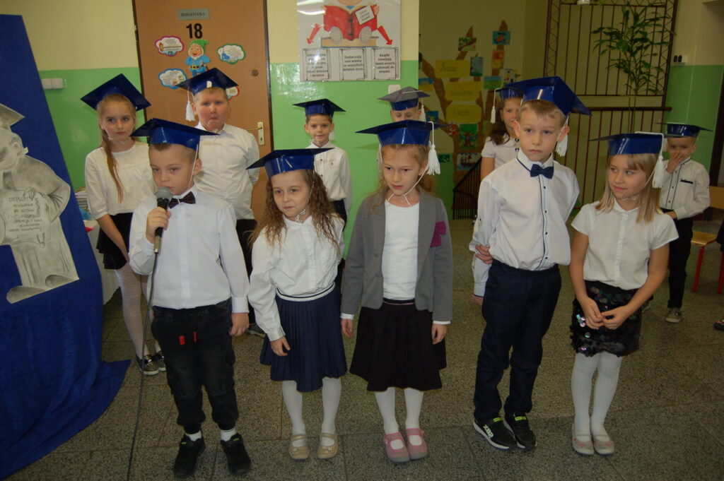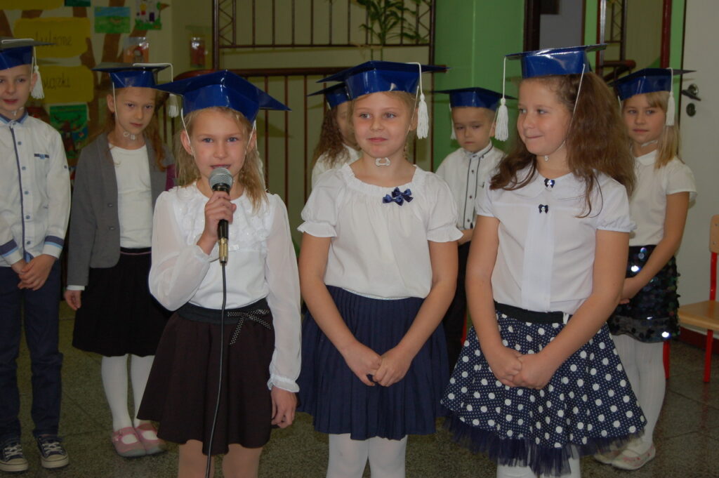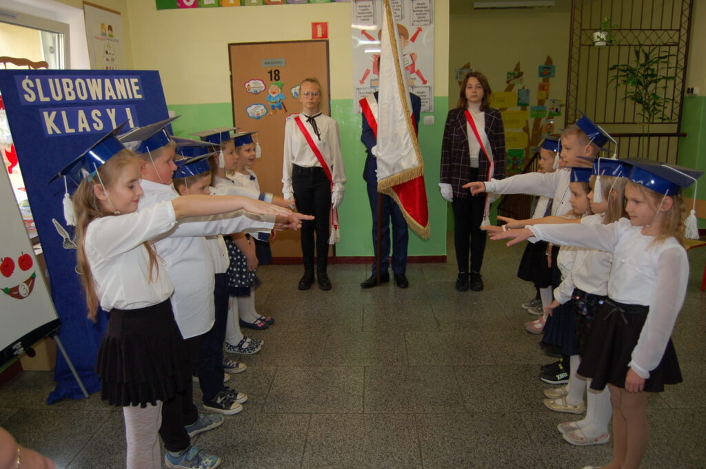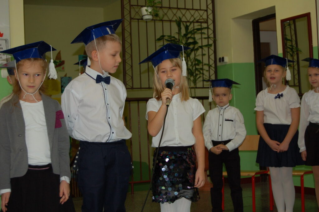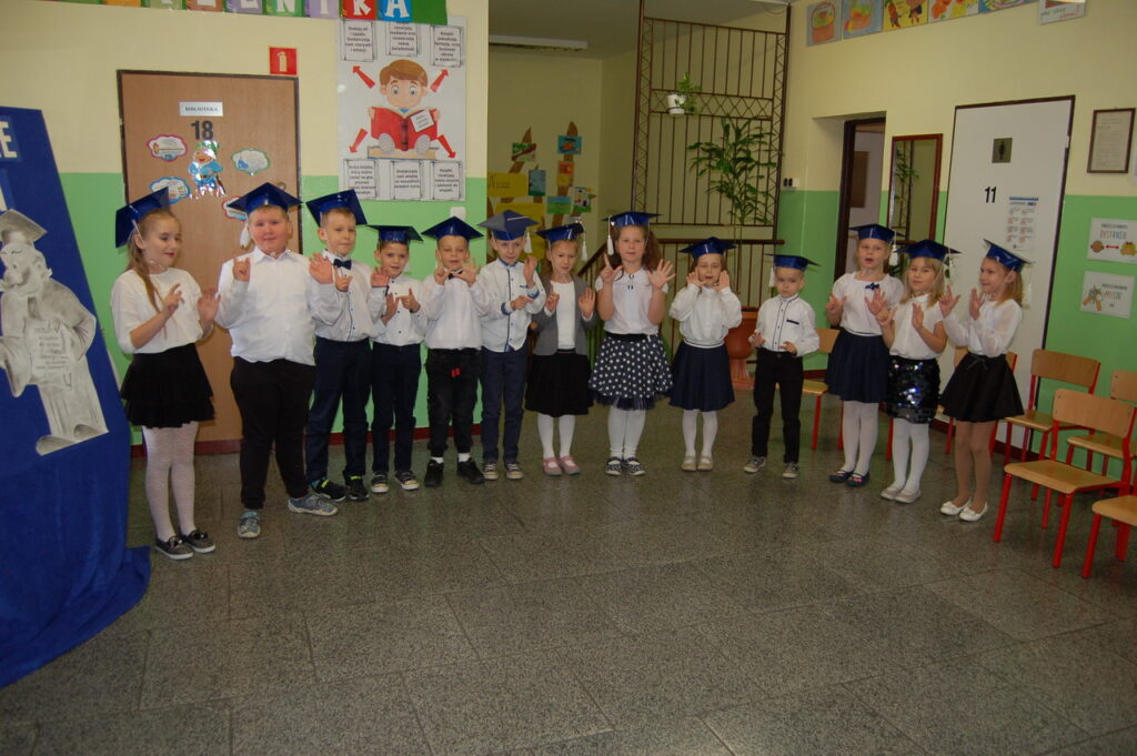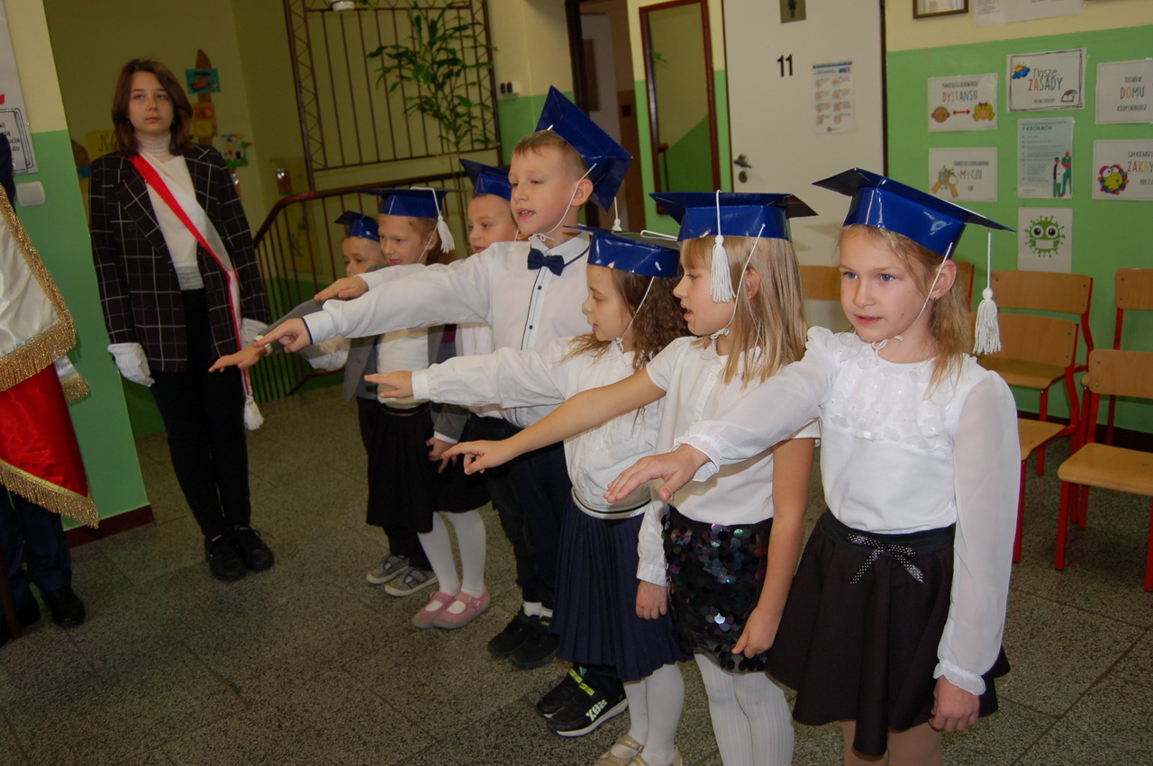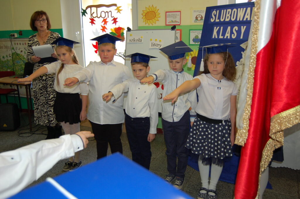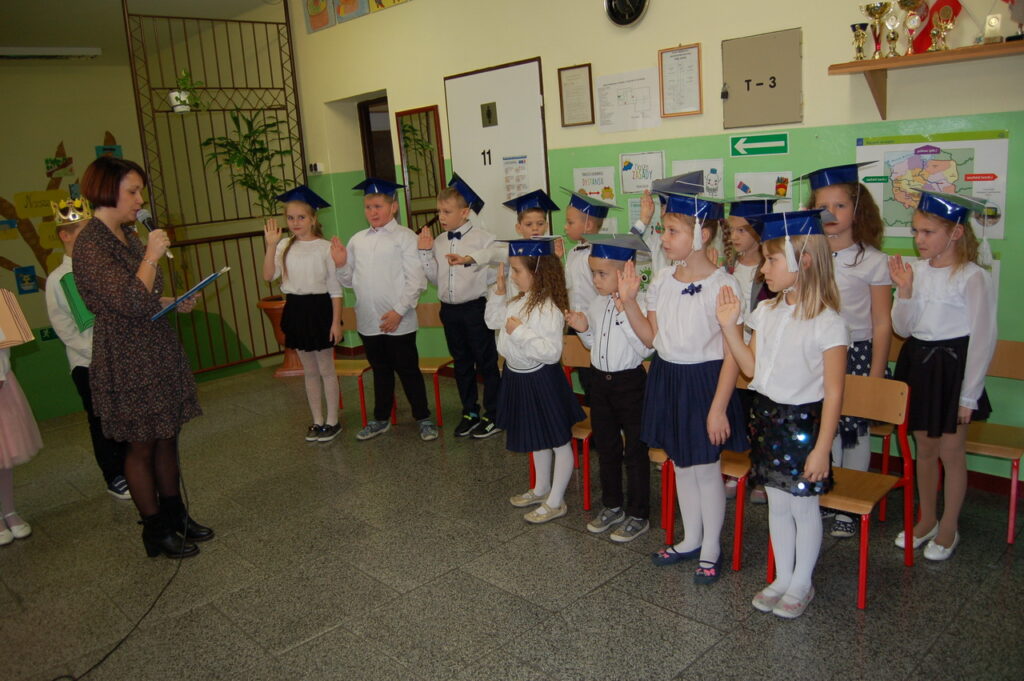 Dzieci przedstawiły krótki program, w którym zaprezentowały swoje umiejętności. Na poczet flagowy uroczyście ślubowały być dobrymi uczniami, kolegami i Polakami. Pani dyrektor Halina Doktór dokonała symbolicznego pasowania uczniów.