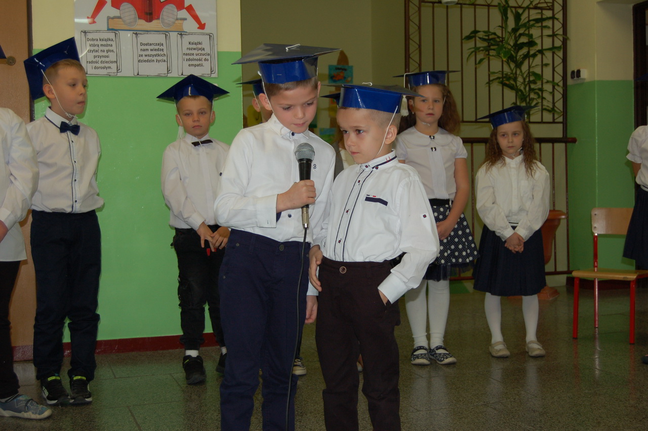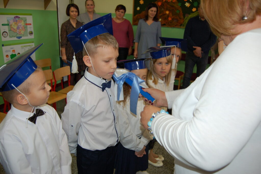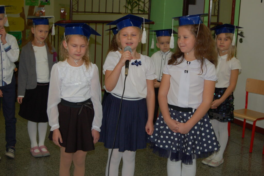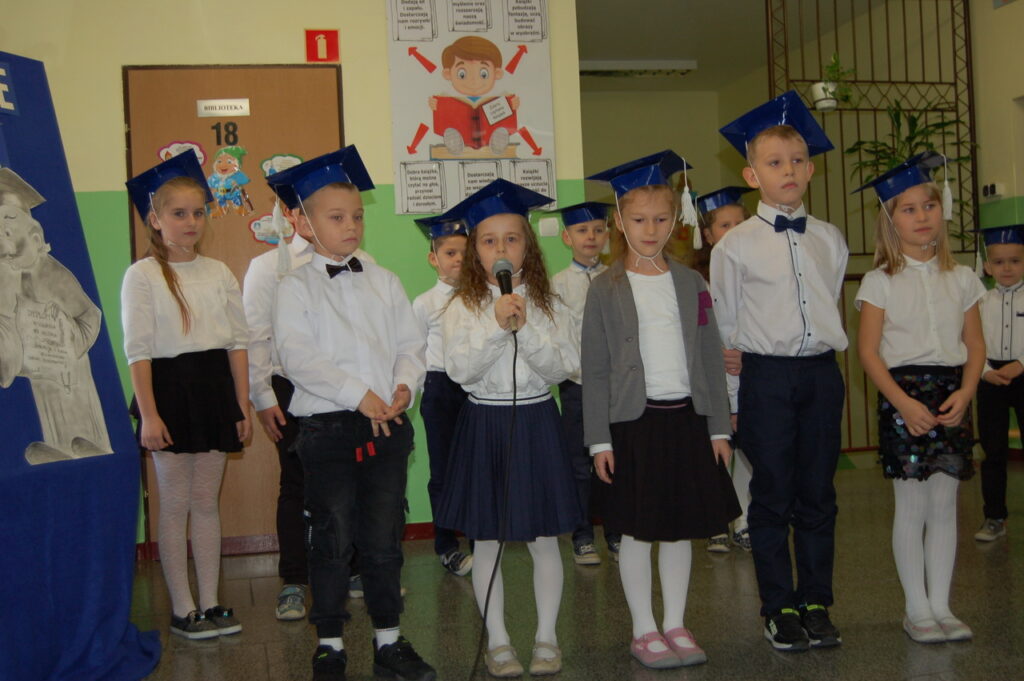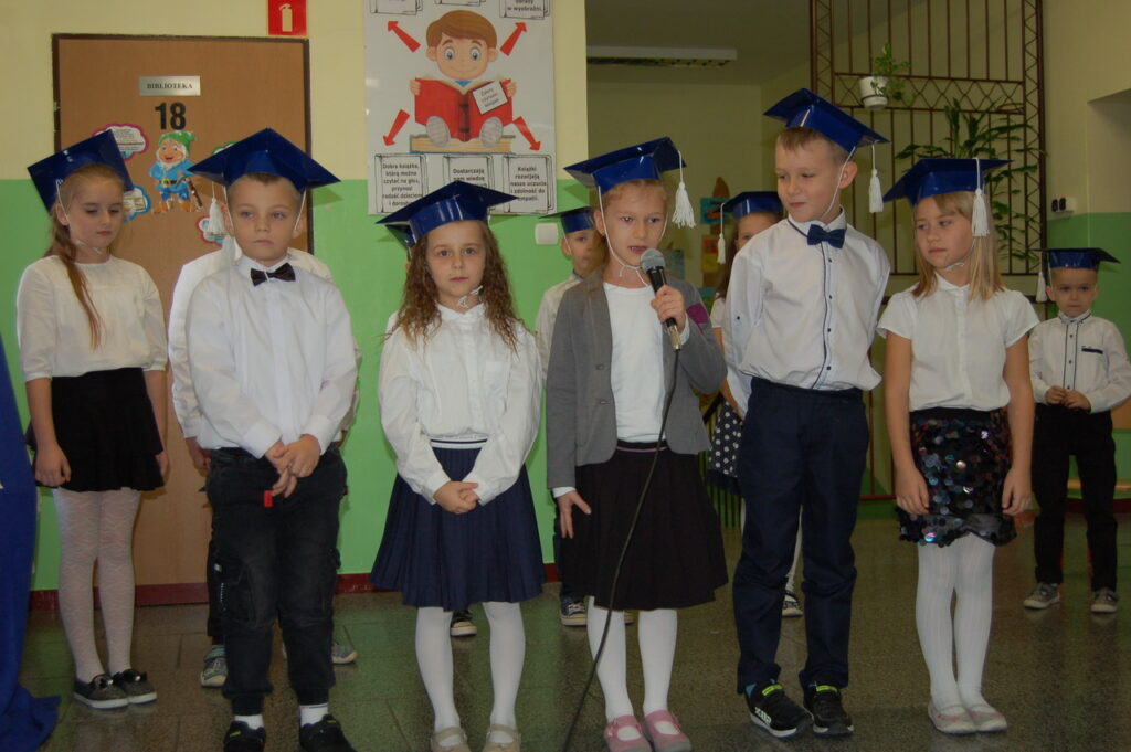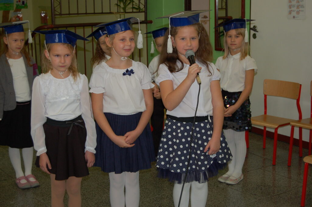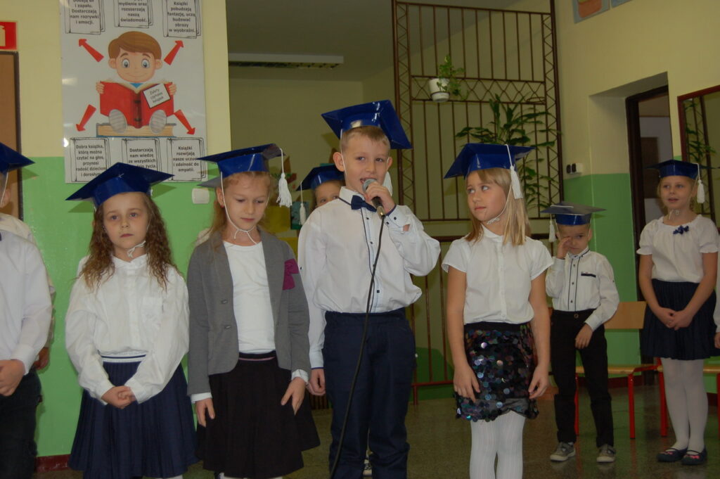 Dzieci przedstawiły krótki program, w którym zaprezentowały swoje umiejętności. Na poczet flagowy uroczyście ślubowały być dobrymi uczniami, kolegami i Polakami. Pani dyrektor Halina Doktór dokonała symbolicznego pasowania uczniów.