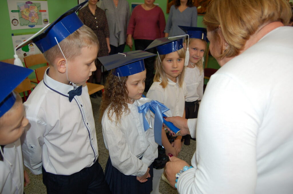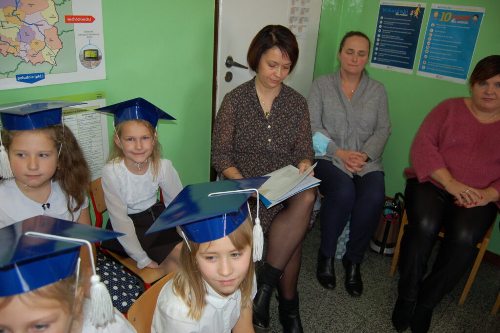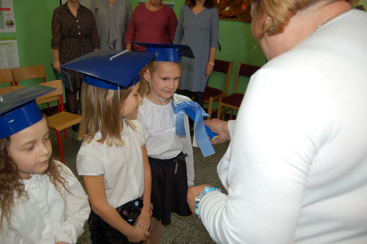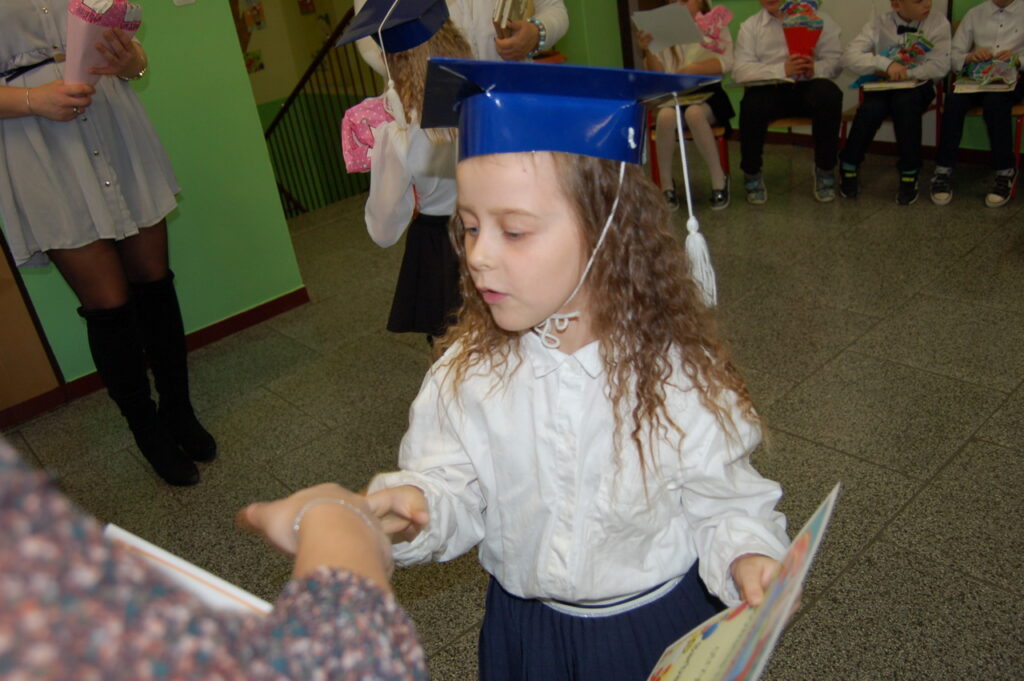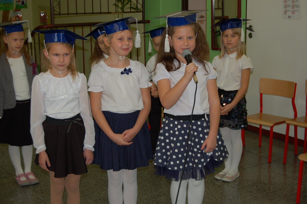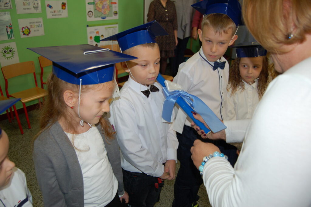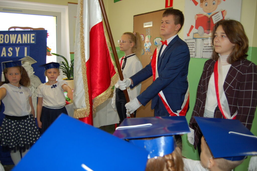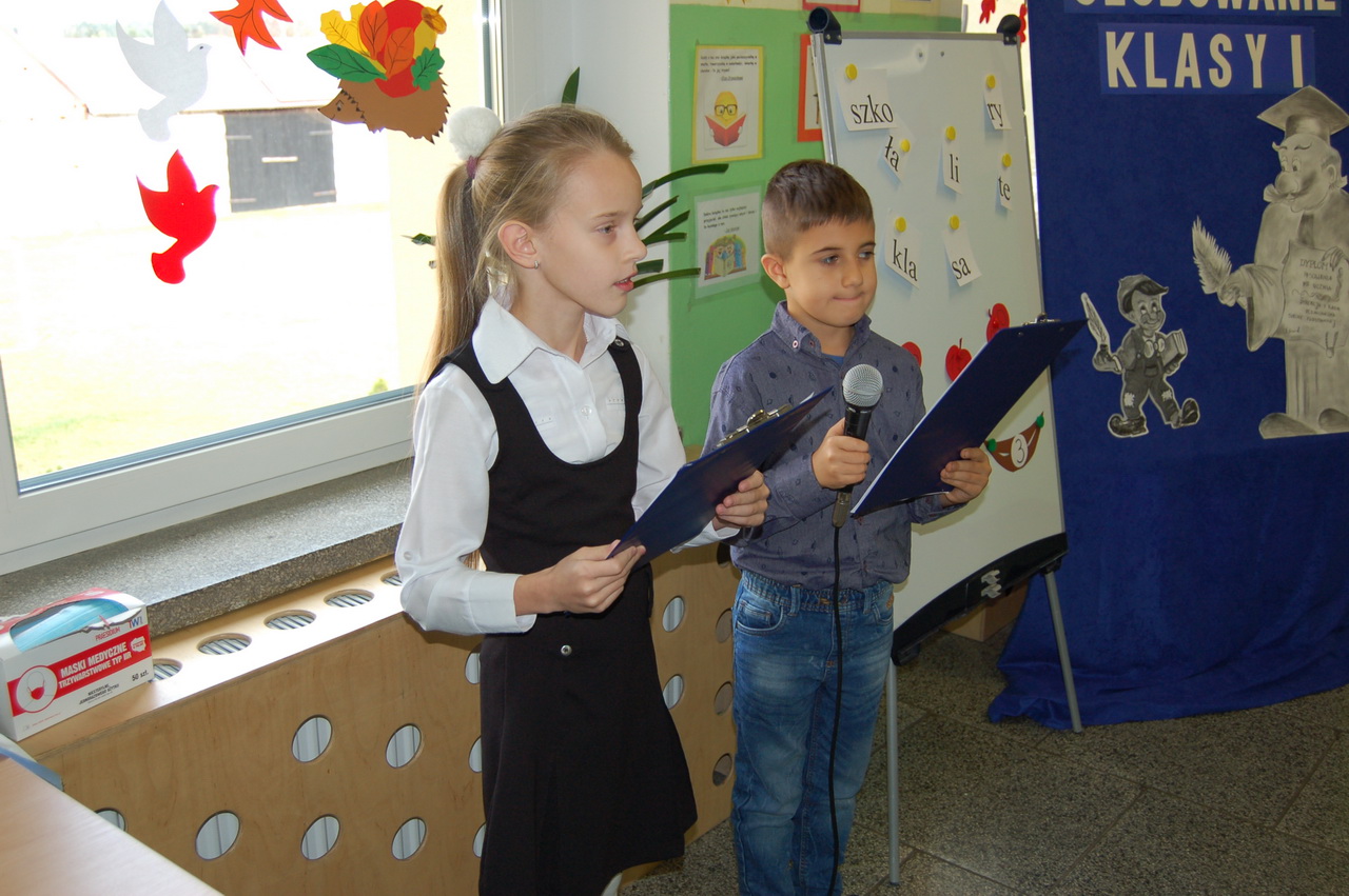 Dzieci przedstawiły krótki program, w którym zaprezentowały swoje umiejętności. Na poczet flagowy uroczyście ślubowały być dobrymi uczniami, kolegami i Polakami. Pani dyrektor Halina Doktór dokonała symbolicznego pasowania uczniów.