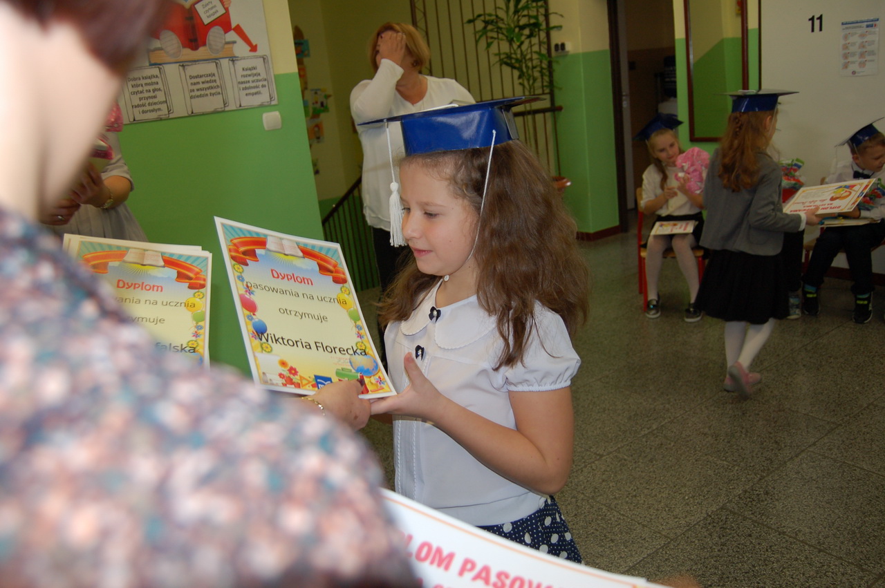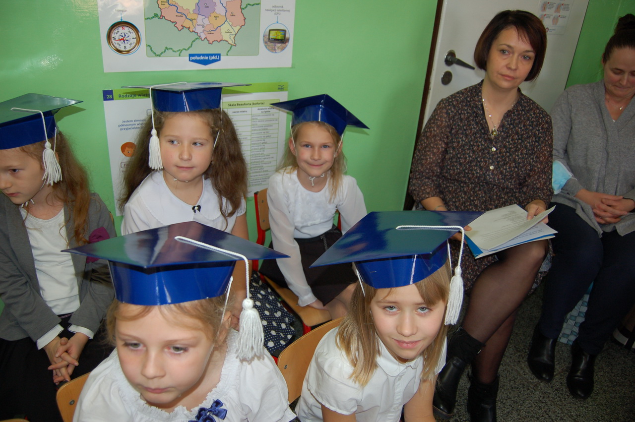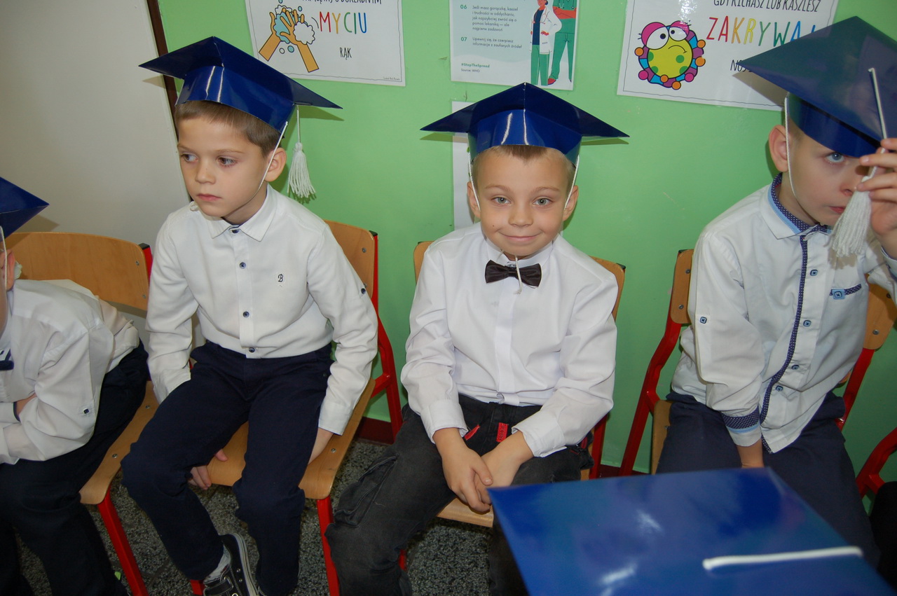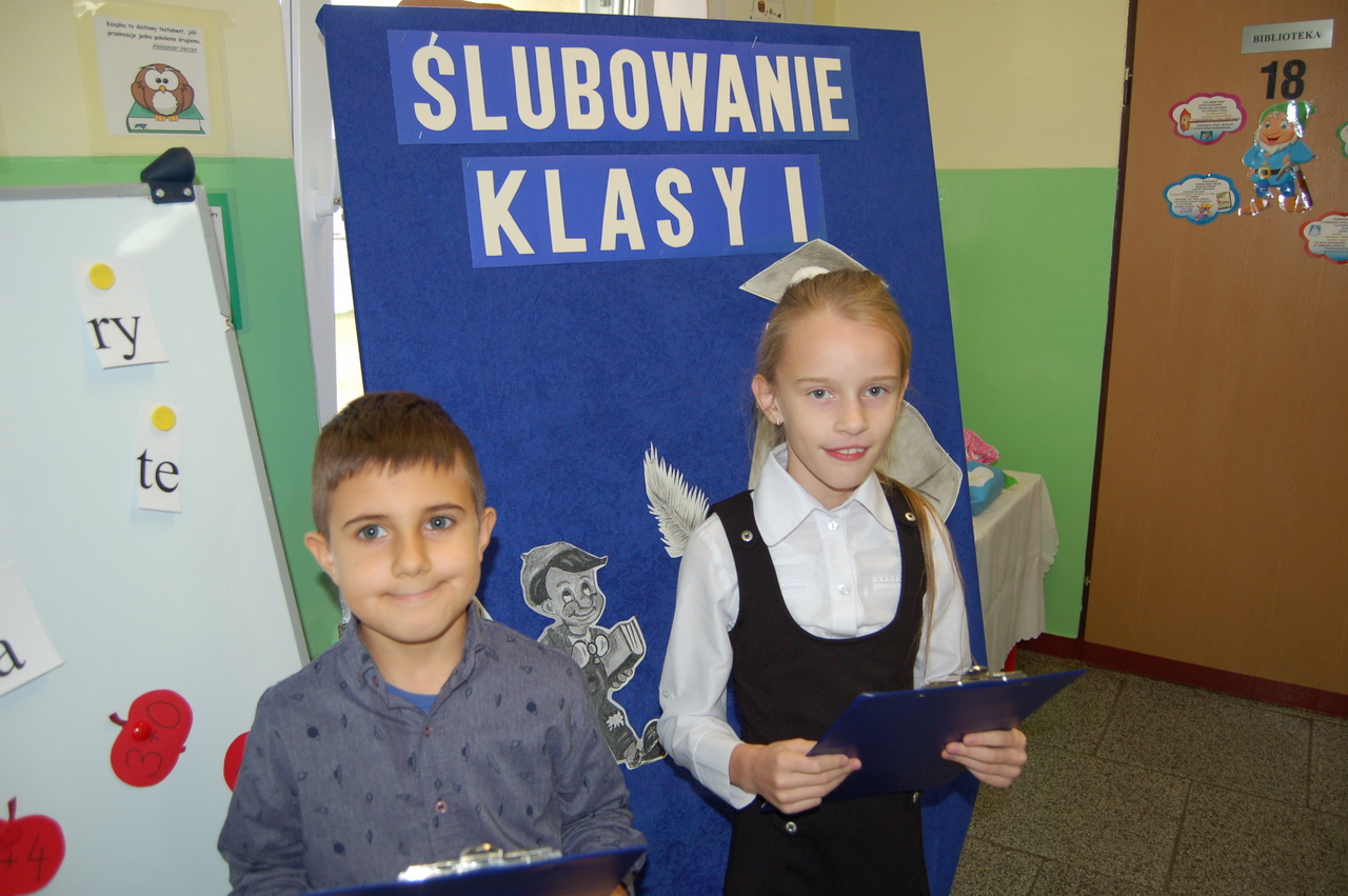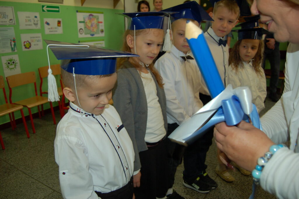 Dzieci przedstawiły krótki program, w którym zaprezentowały swoje umiejętności. Na poczet flagowy uroczyście ślubowały być dobrymi uczniami, kolegami i Polakami. Pani dyrektor Halina Doktór dokonała symbolicznego pasowania uczniów.