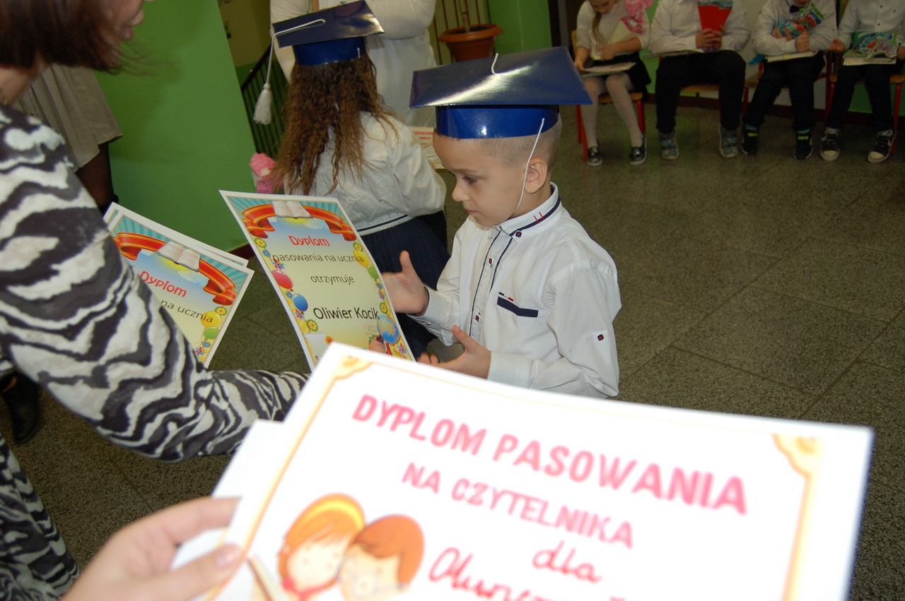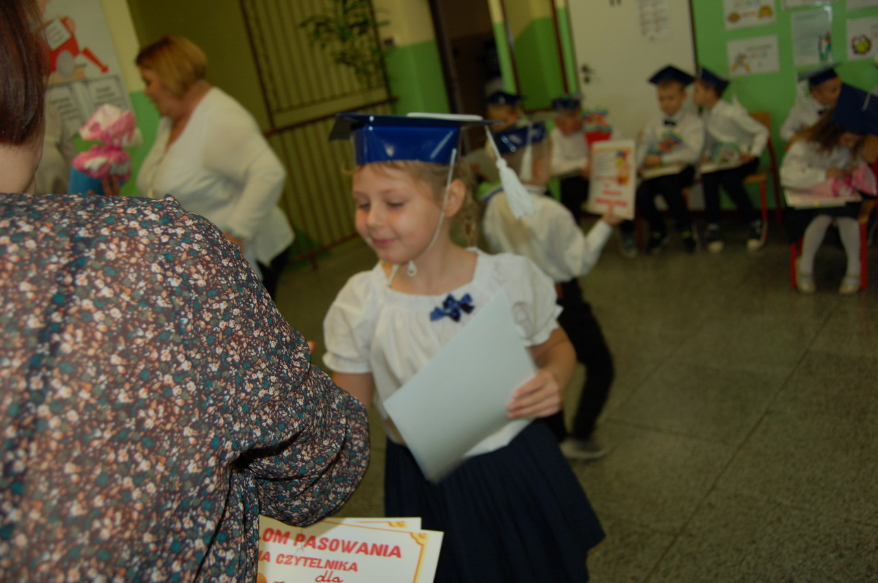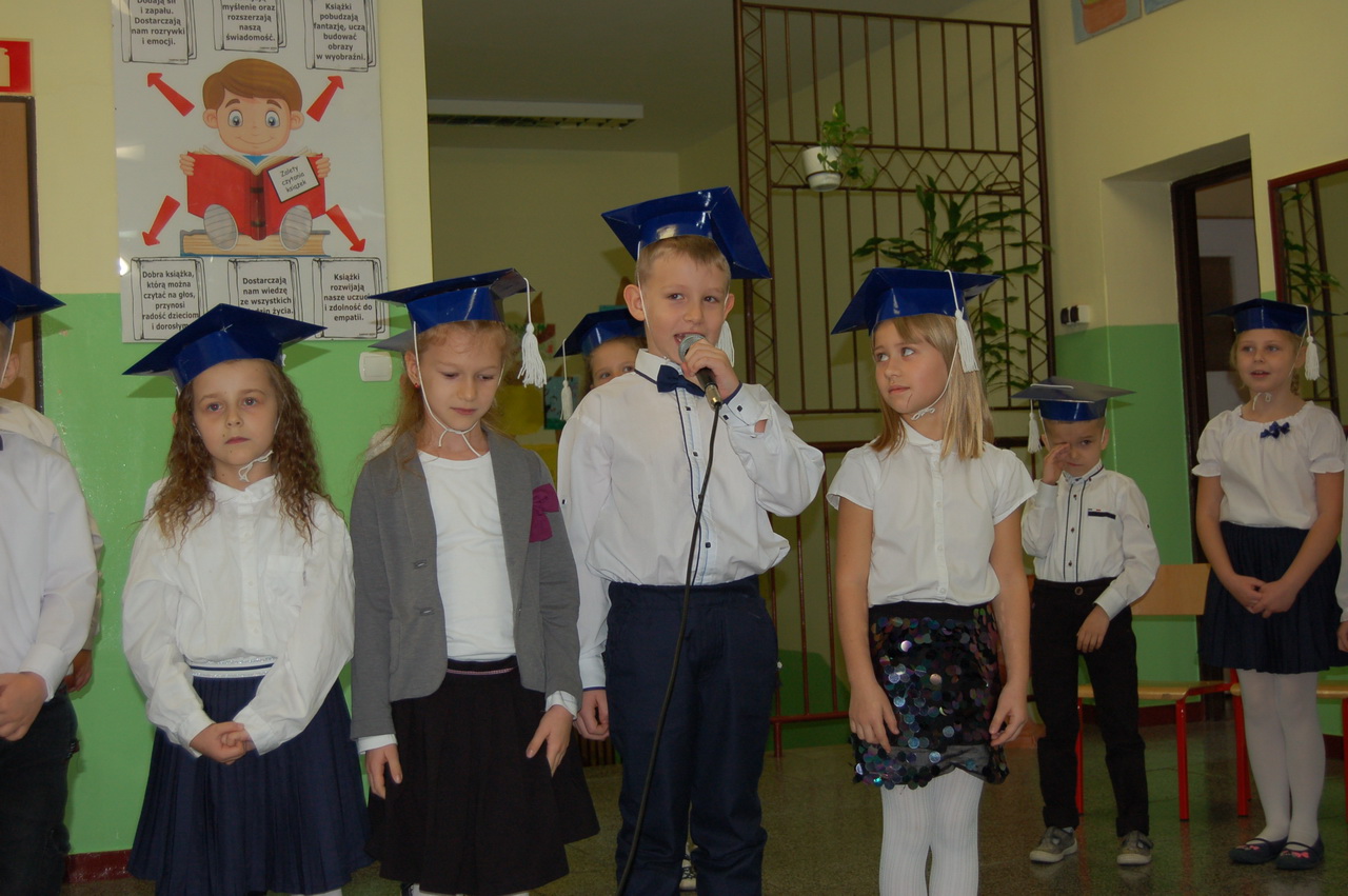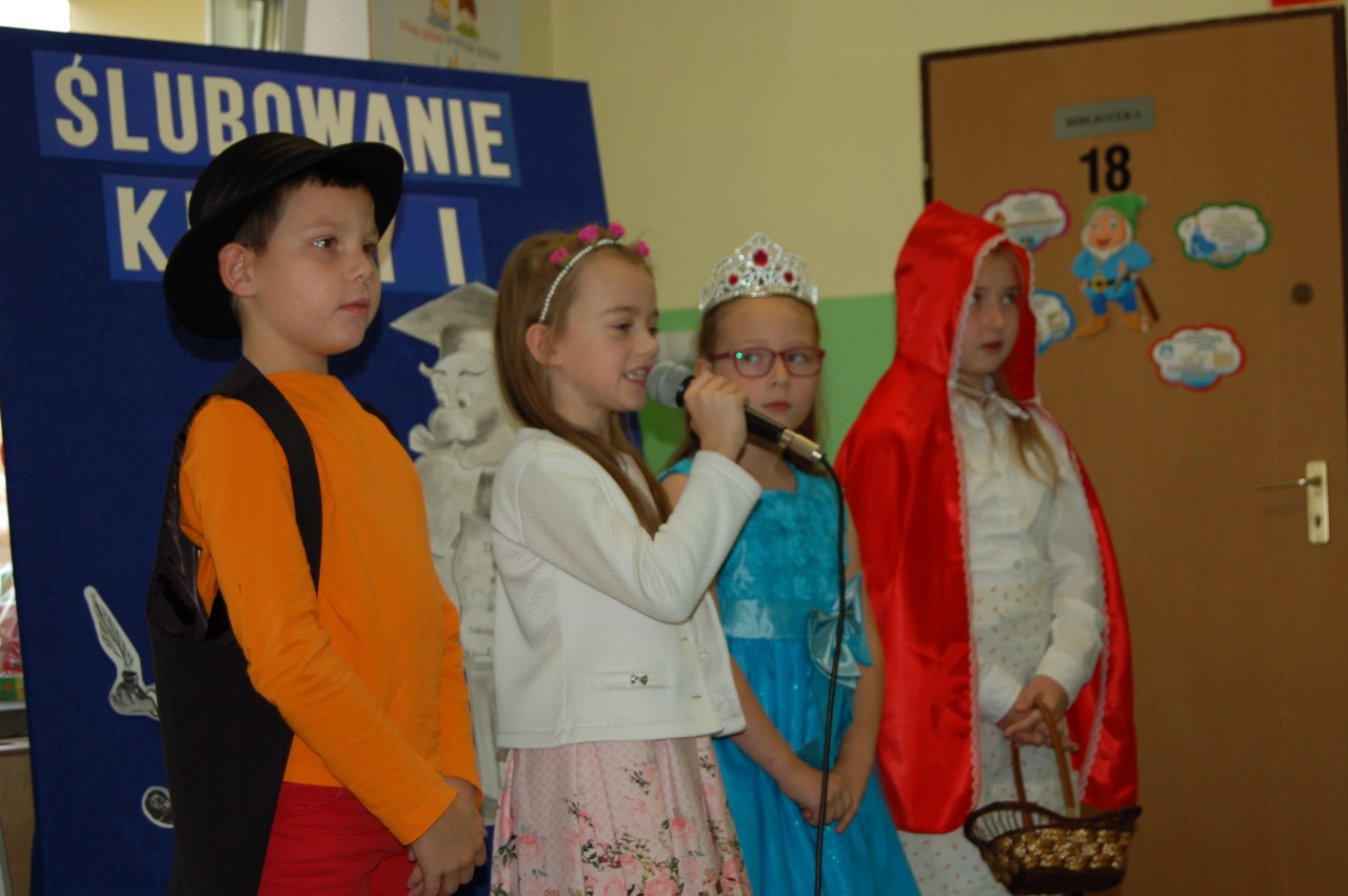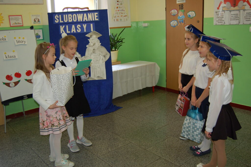 Kolejnym ważnym punktem uroczystości było oficjalne przyjęcie uczniów klasy pierwszej do grona czytelników biblioteki szkolnej. Inscenizacja przygotowana przez koleżanki i kolegów z kl. II i III, przekazała młodym czytelnikom, że biblioteka to miejsce bezpieczne, przyjazne i radosne. Po takim wprowadzeniu, skupione i poważne uroczyście przyrzekły, że będą kochać i szanować książki, korzystać z ich mądrości i sumiennie wypełniać obowiązki czytelnika.