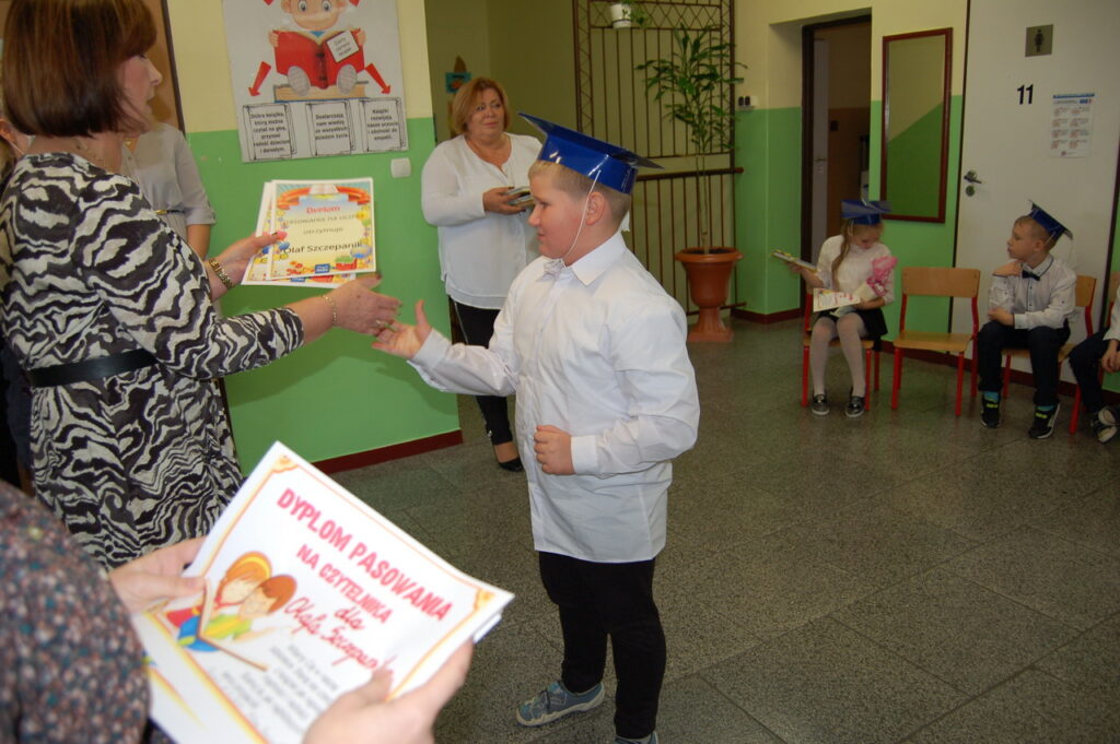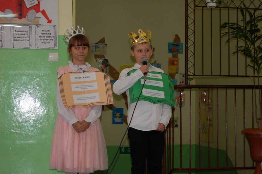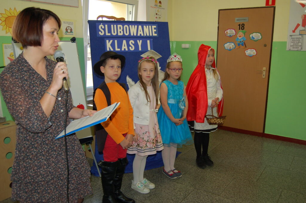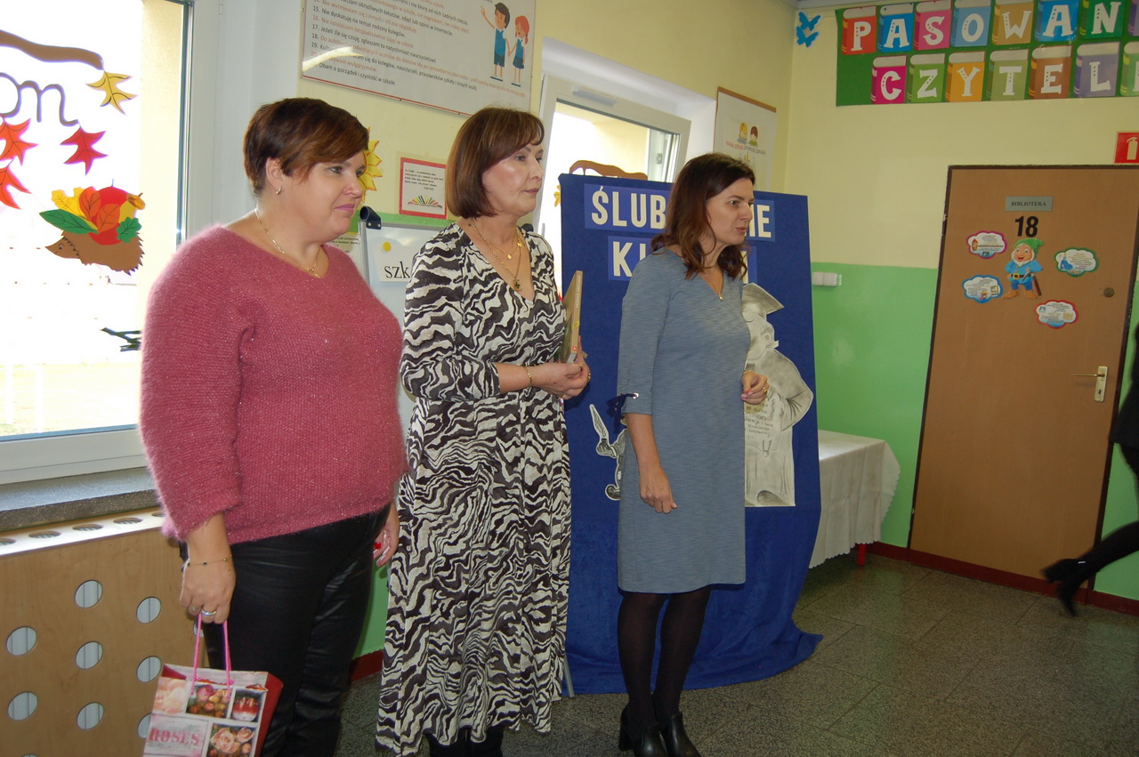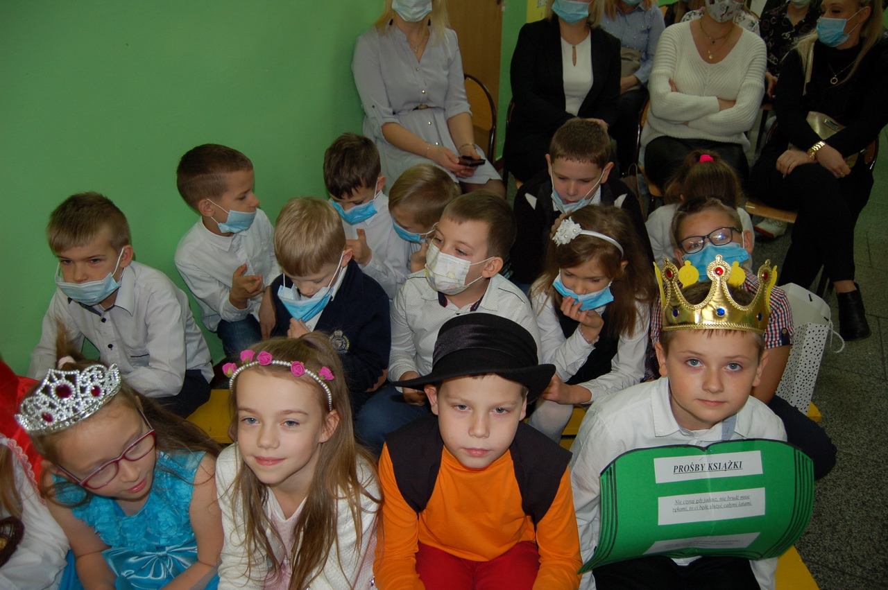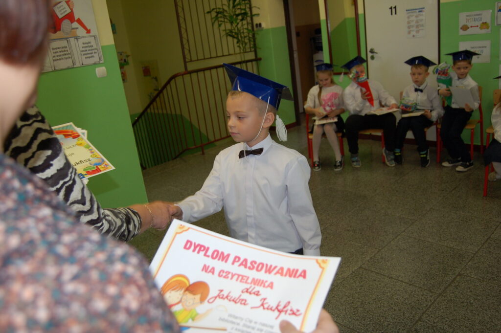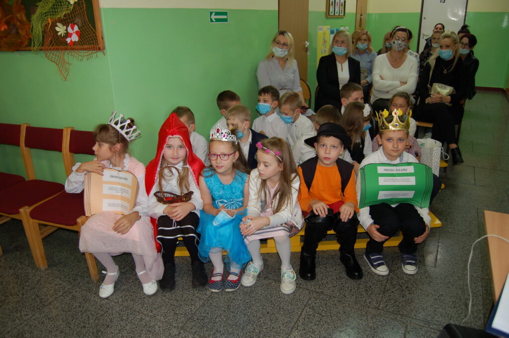 Kolejnym ważnym punktem uroczystości było oficjalne przyjęcie uczniów klasy pierwszej do grona czytelników biblioteki szkolnej. Inscenizacja przygotowana przez koleżanki i kolegów z kl. II i III, przekazała młodym czytelnikom, że biblioteka to miejsce bezpieczne, przyjazne i radosne. Po takim wprowadzeniu, skupione i poważne uroczyście przyrzekły, że będą kochać i szanować książki, korzystać z ich mądrości i sumiennie wypełniać obowiązki czytelnika.
