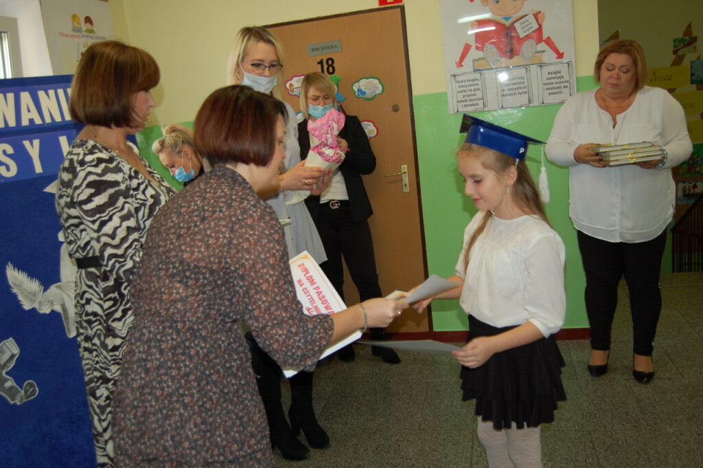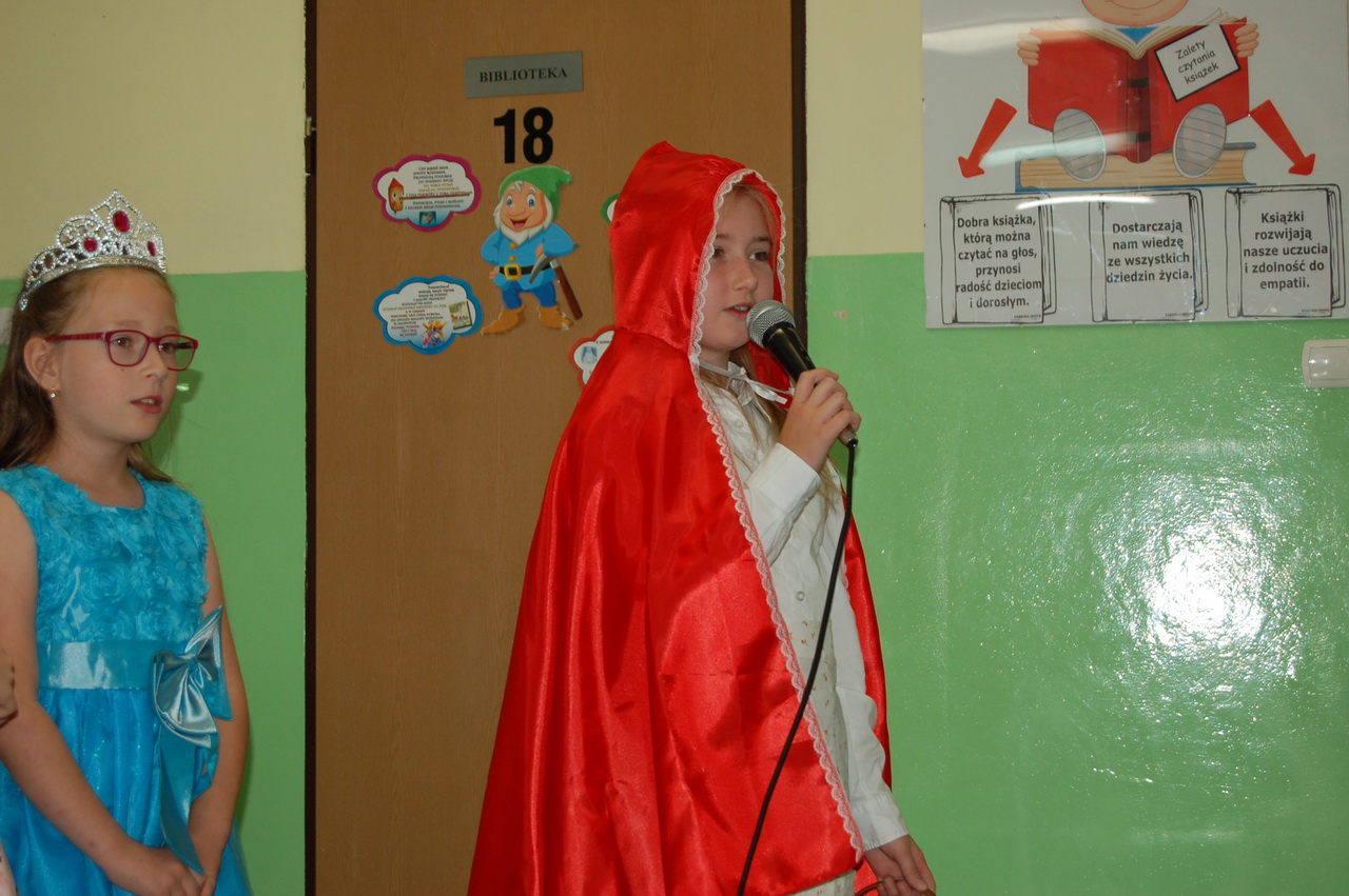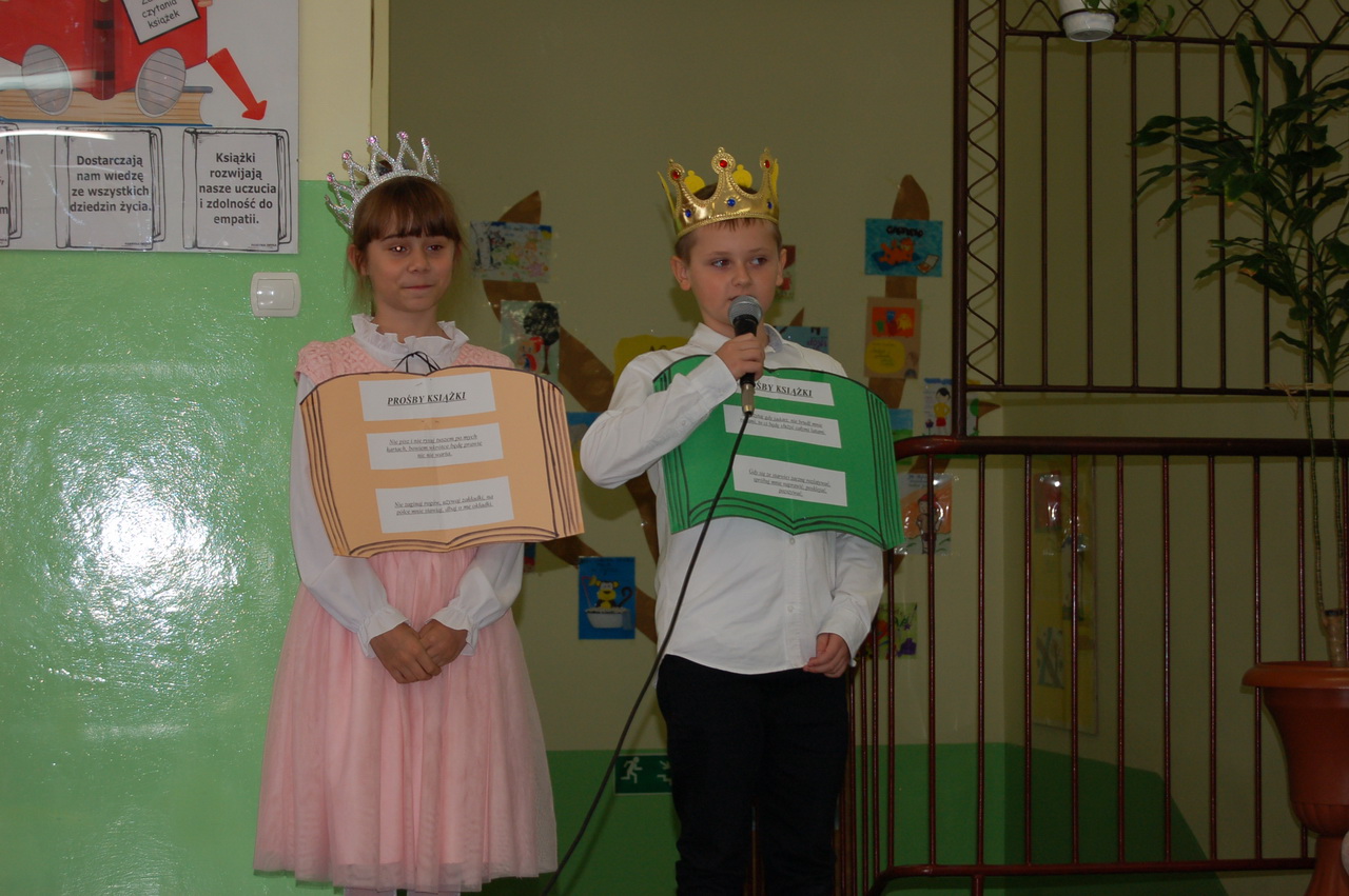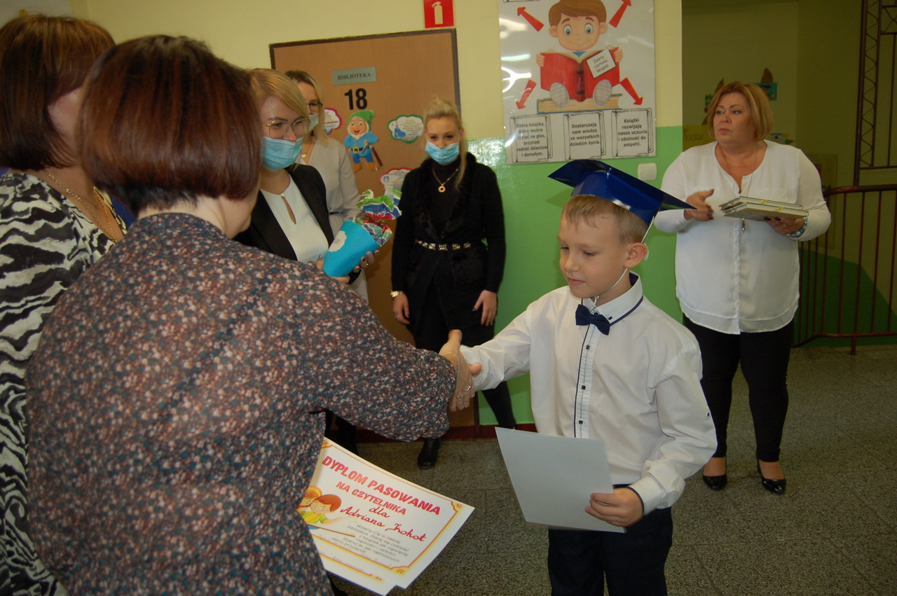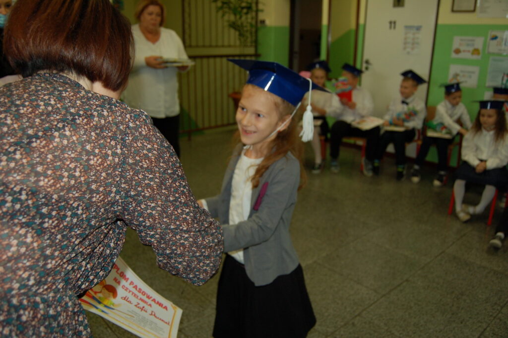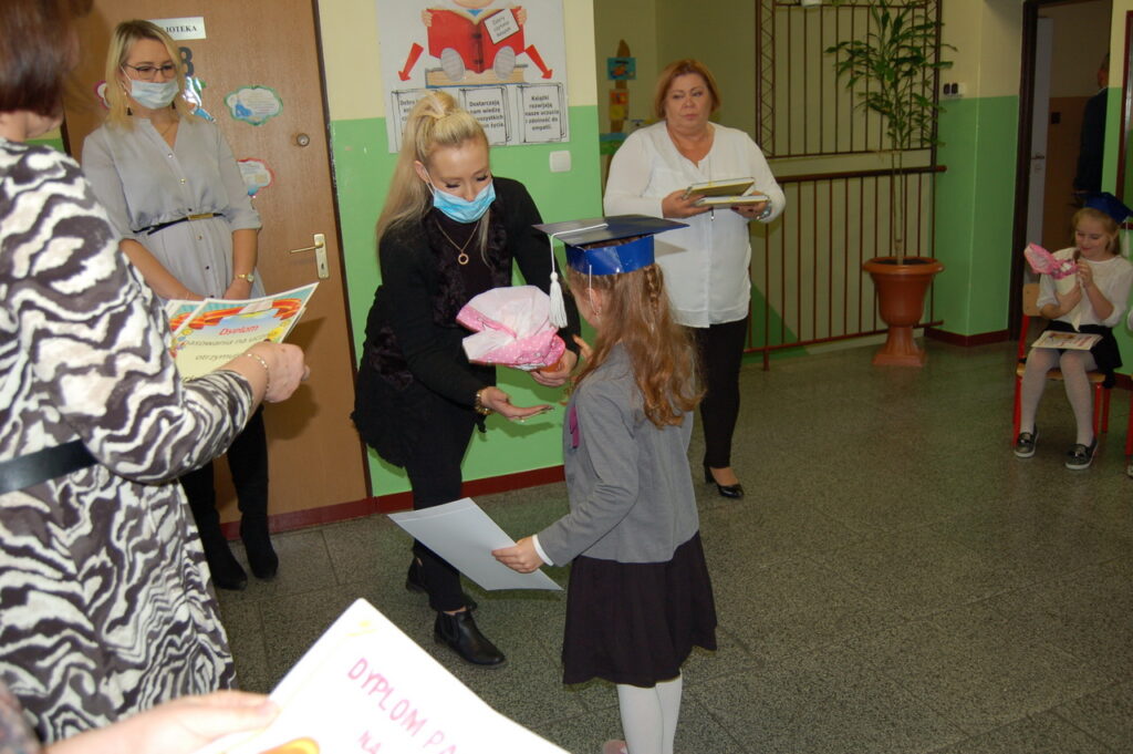 Kolejnym ważnym punktem uroczystości było oficjalne przyjęcie uczniów klasy pierwszej do grona czytelników biblioteki szkolnej. Inscenizacja przygotowana przez koleżanki i kolegów z kl. II i III, przekazała młodym czytelnikom, że biblioteka to miejsce bezpieczne, przyjazne i radosne. Po takim wprowadzeniu, skupione i poważne uroczyście przyrzekły, że będą kochać i szanować książki, korzystać z ich mądrości i sumiennie wypełniać obowiązki czytelnika.