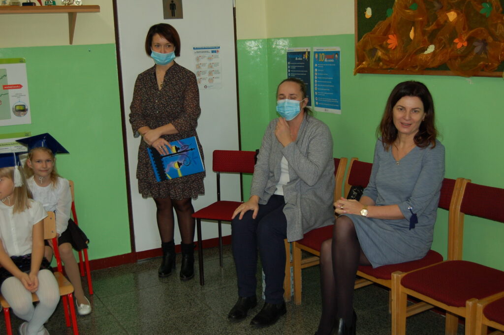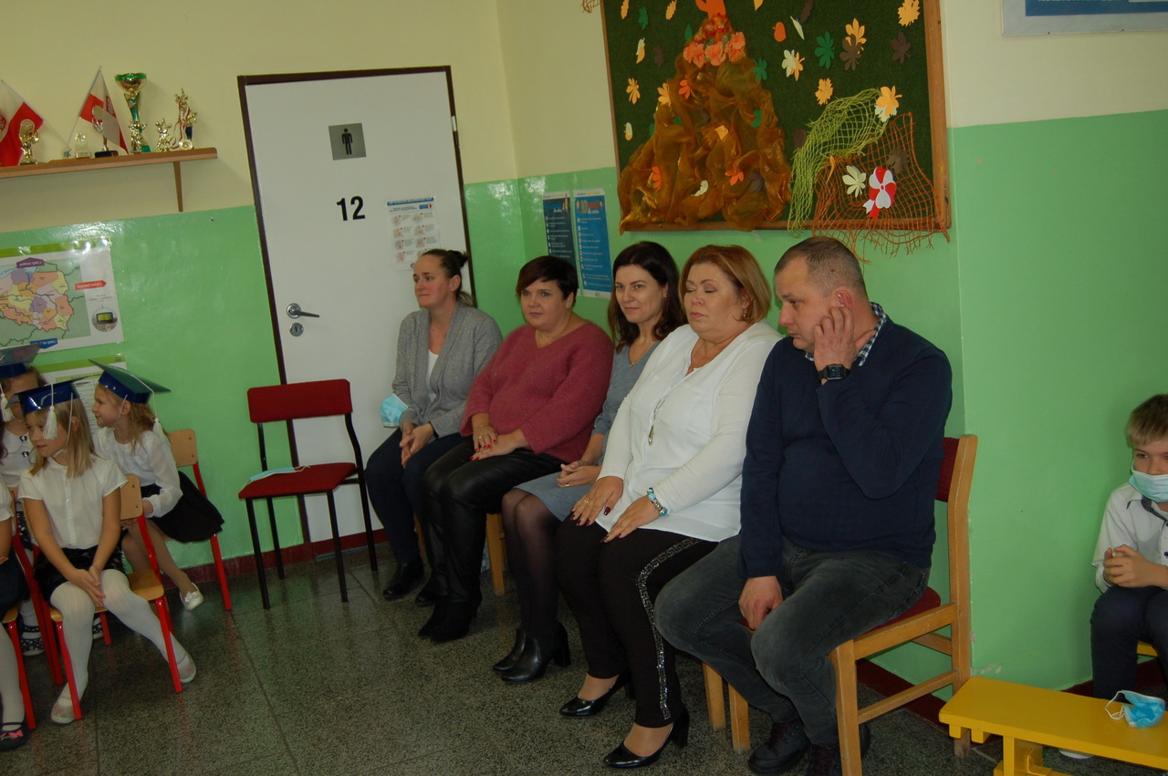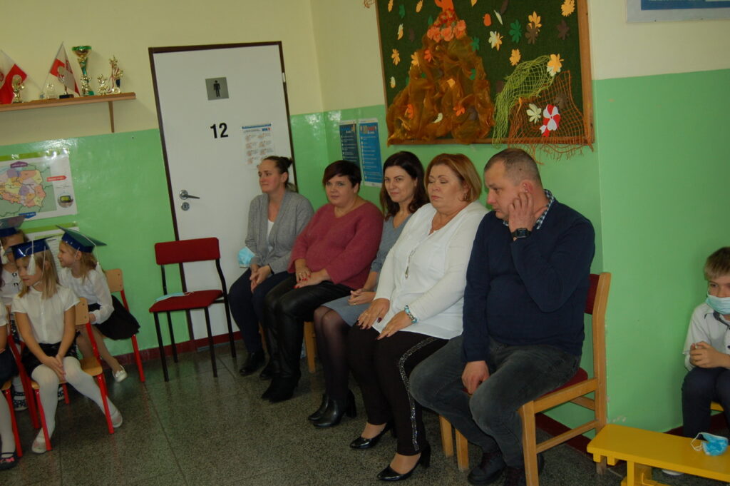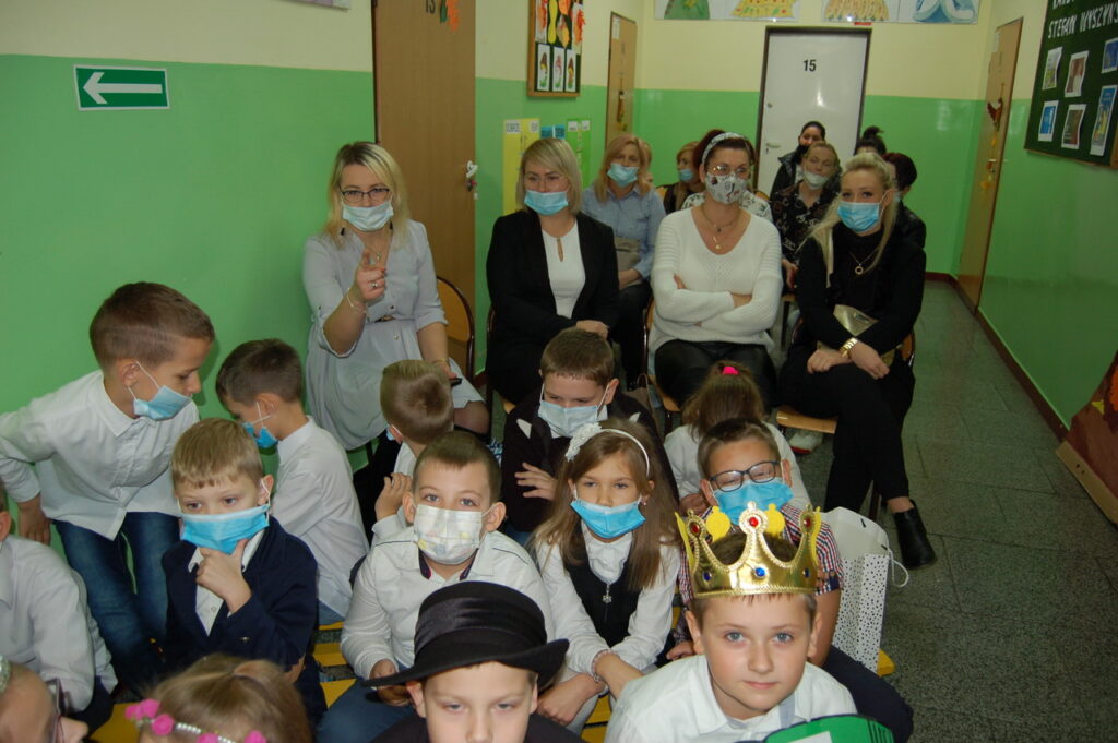 W naszej szkole uroczystość pasowania na ucznia odbyła się 18.11.2021 r., na którą przybyli zaproszeni goście : Pani Justyna Maryniak -Sekretarz Gminy Sośnie, Pani Arleta Zadka – Dyrektor CUW w Sośniach, Pani Katarzyna Leśniak – Przewodnicząca Rady Rodziców oraz rodzice uczniów klasy I.