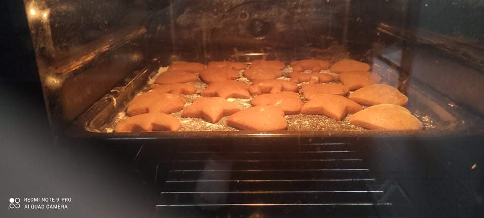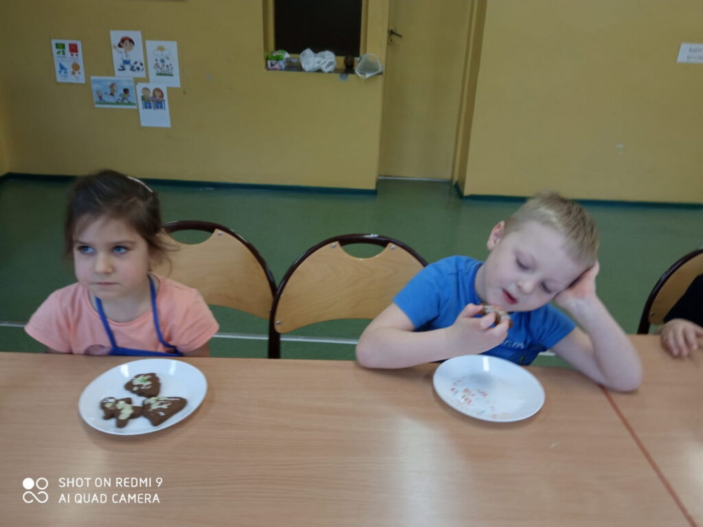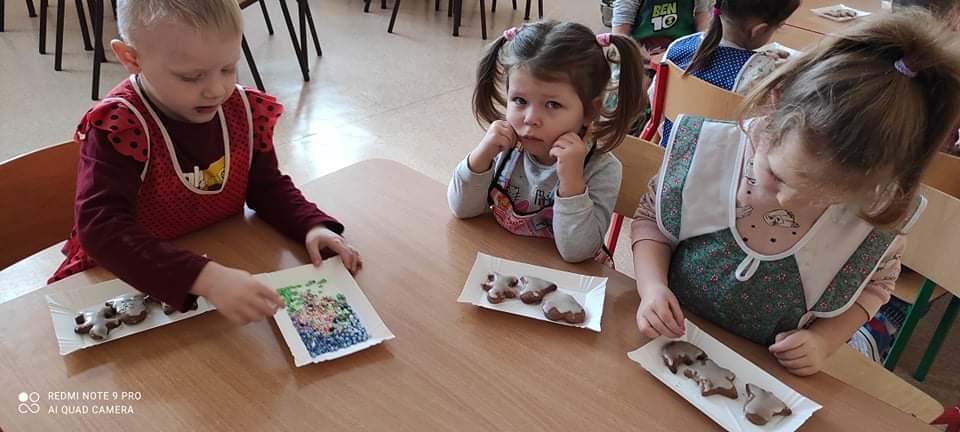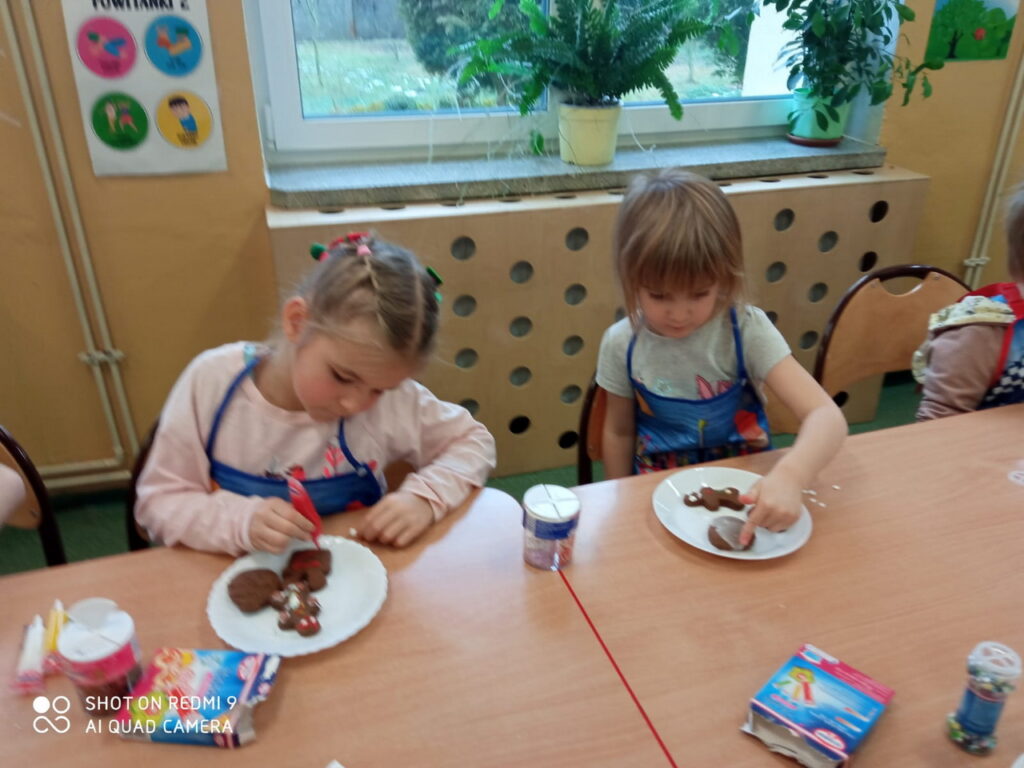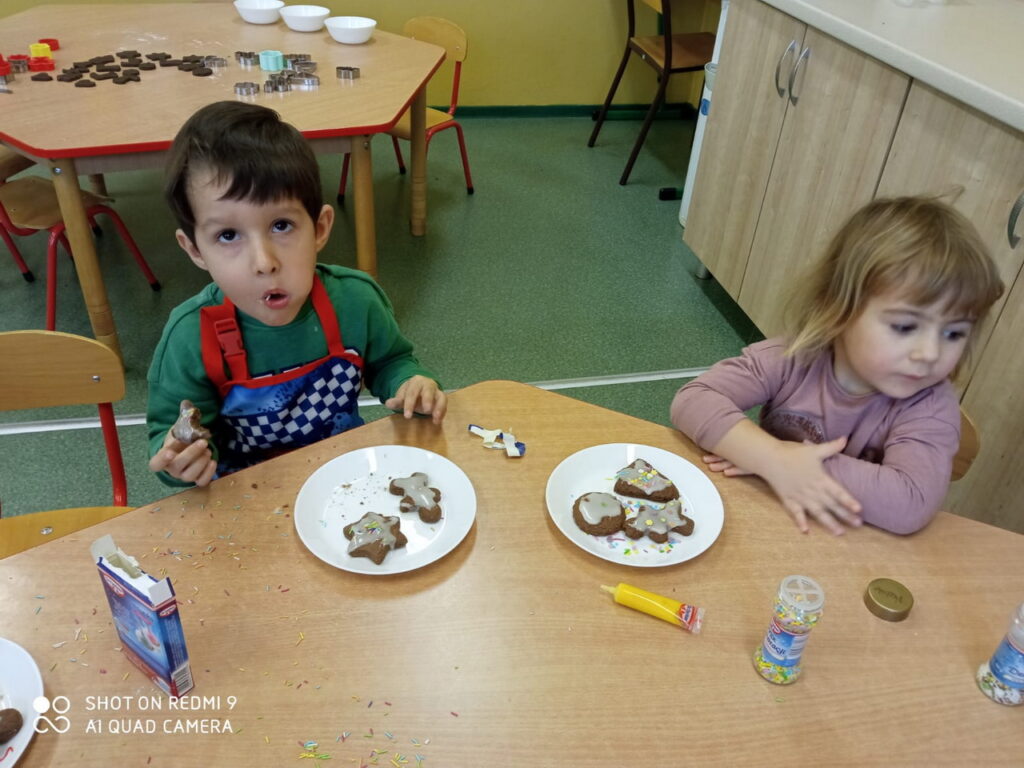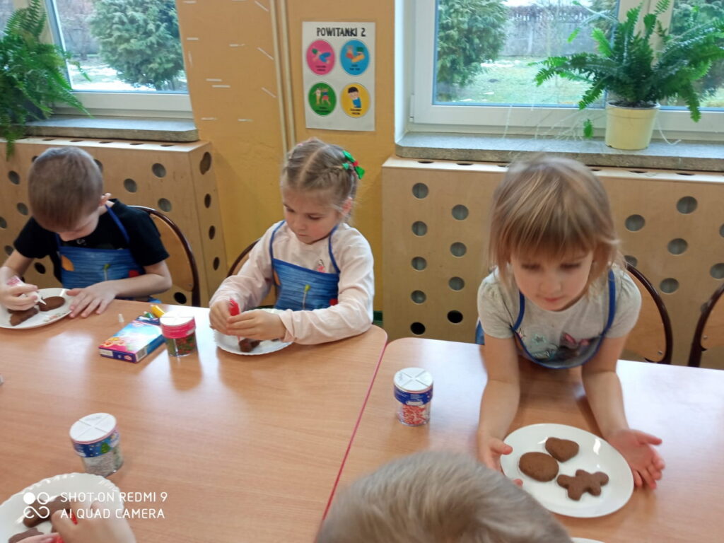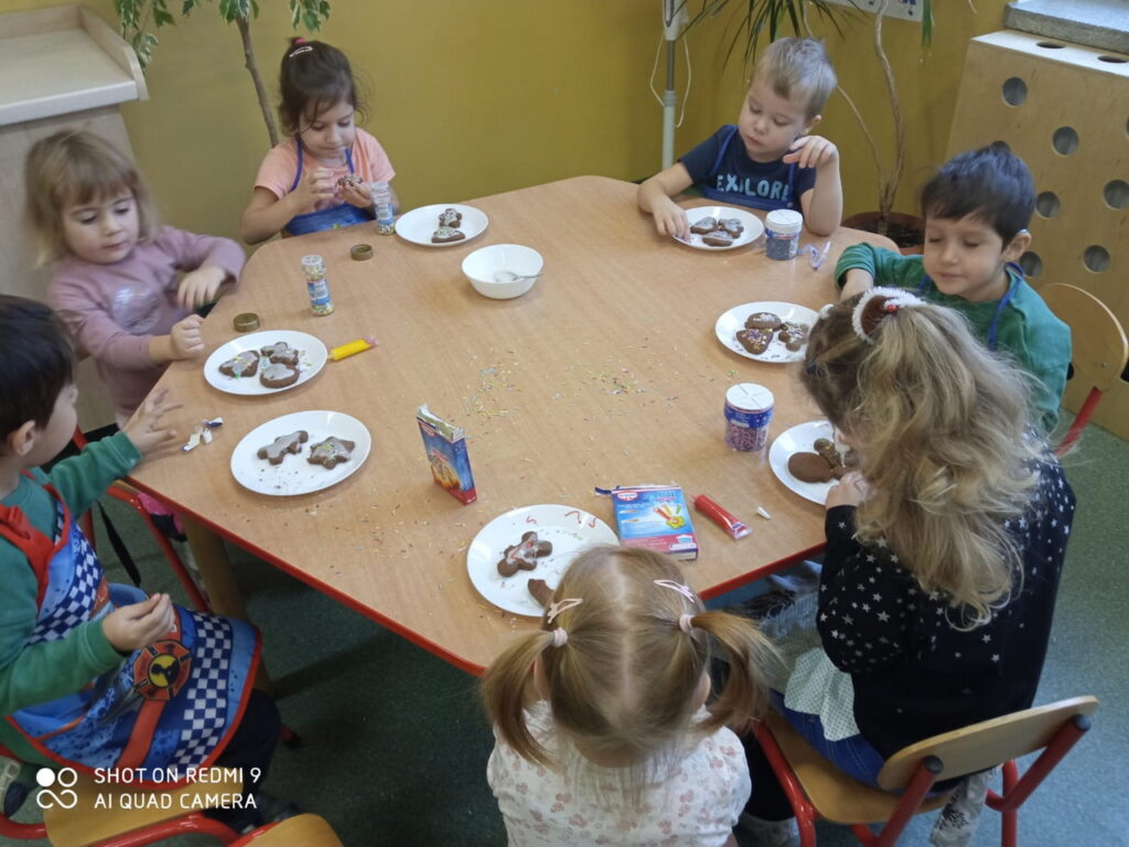 Z przygotowanego przez Panie ciasta, wykrawały foremkami w świątecznych kształtach pyszne ciasteczka. Następnie słodkie ciasteczka piekły się w przedszkolnej kuchni. Po przedszkolu zaczął unosić się wspaniały zapach pieczonych pierniczków, który wprawił wszystkich w świąteczny nastrój. Gdy pierniczki były już gotowe, dzieci przystąpiły do ich dekorowania słodkim lukrem i barwnymi posypkami. Zabawa była doskonała, a pierniczki wyszły przepiękne.