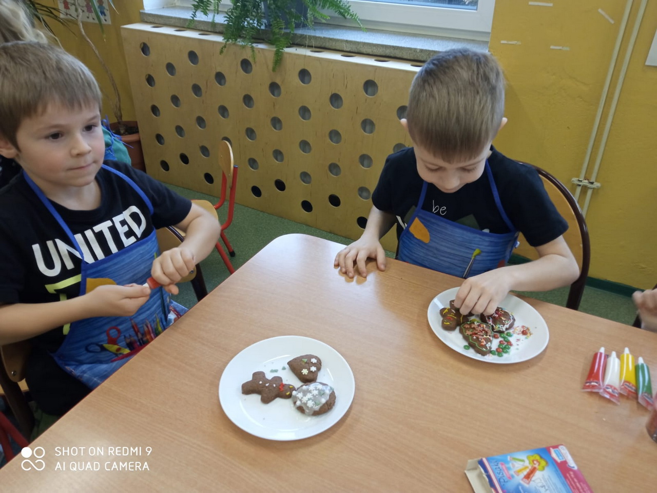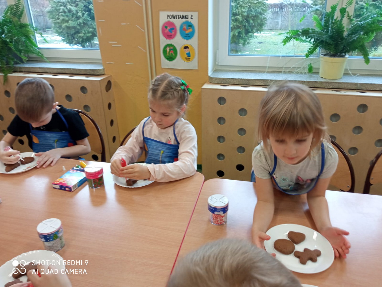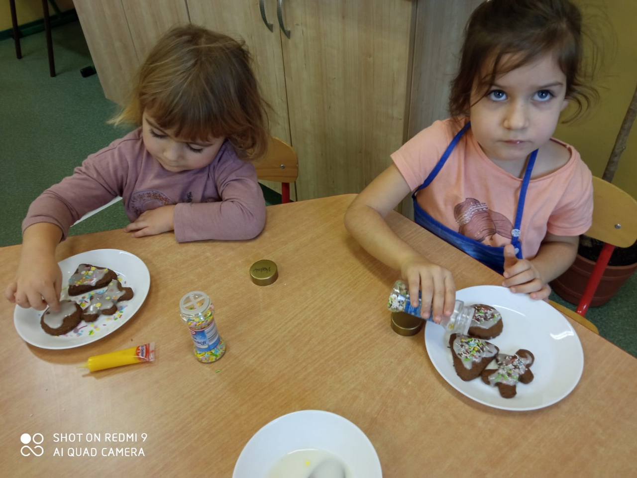 Z przygotowanego przez Panie ciasta, wykrawały foremkami w świątecznych kształtach pyszne ciasteczka. Następnie słodkie ciasteczka piekły się w przedszkolnej kuchni. Po przedszkolu zaczął unosić się wspaniały zapach pieczonych pierniczków, który wprawił wszystkich w świąteczny nastrój. Gdy pierniczki były już gotowe, dzieci przystąpiły do ich dekorowania słodkim lukrem i barwnymi posypkami. Zabawa była doskonała, a pierniczki wyszły przepiękne.