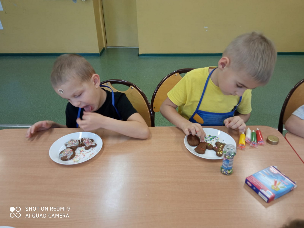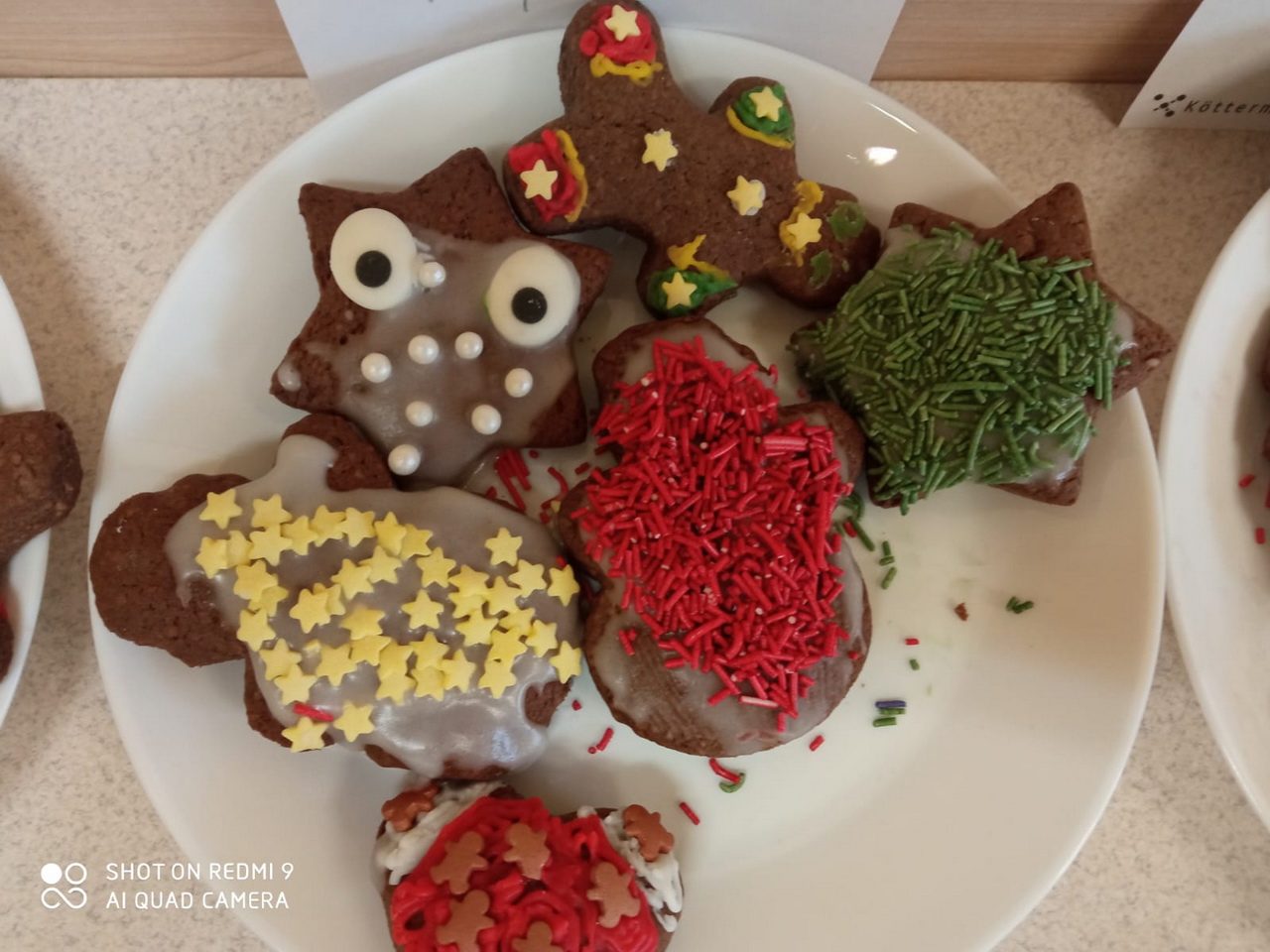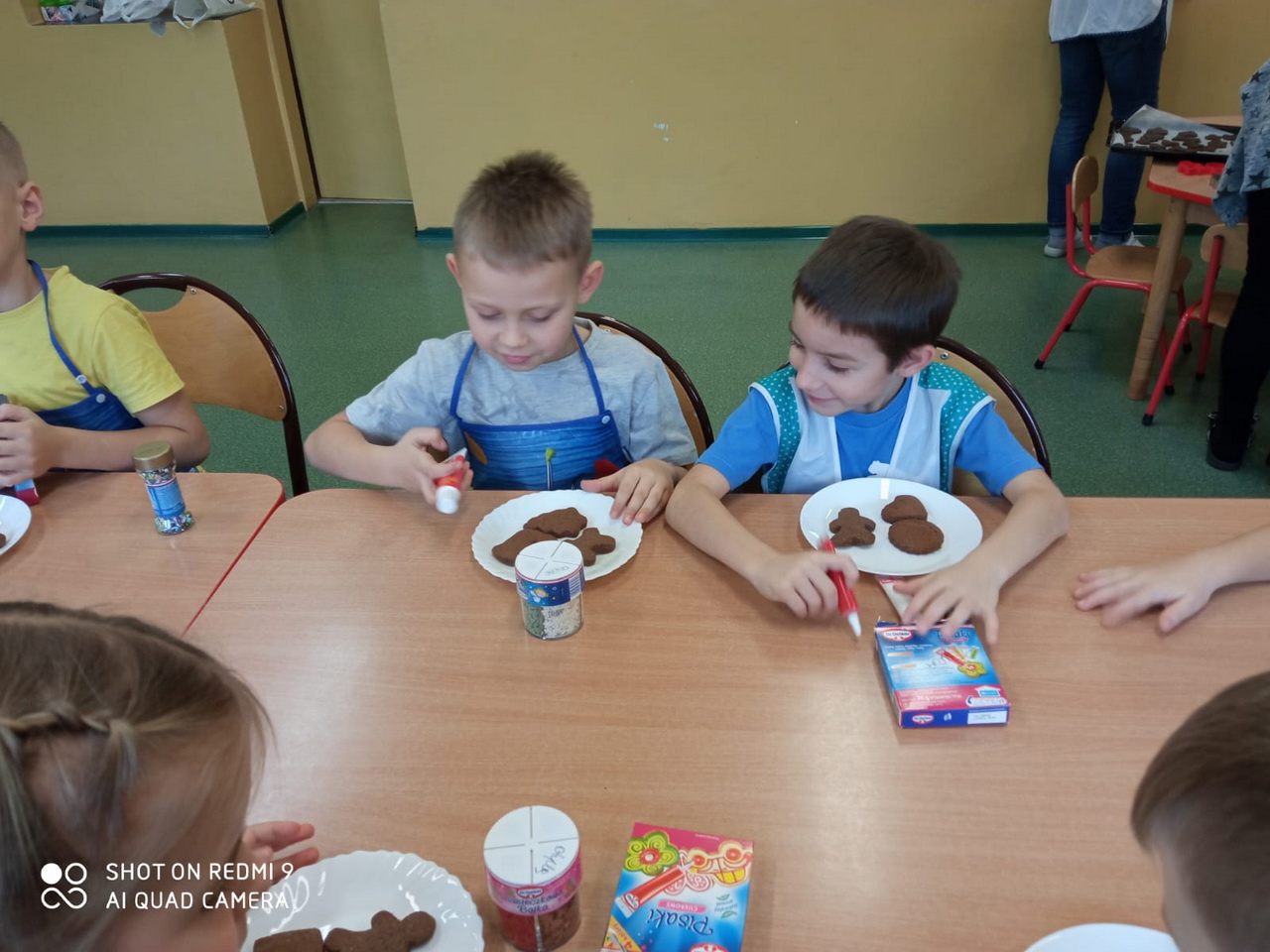Z przygotowanego przez Panie ciasta, wykrawały foremkami w świątecznych kształtach pyszne ciasteczka. Następnie słodkie ciasteczka piekły się w przedszkolnej kuchni. Po przedszkolu zaczął unosić się wspaniały zapach pieczonych pierniczków, który wprawił wszystkich w świąteczny nastrój. Gdy pierniczki były już gotowe, dzieci przystąpiły do ich dekorowania słodkim lukrem i barwnymi posypkami. Zabawa była doskonała, a pierniczki wyszły przepiękne.