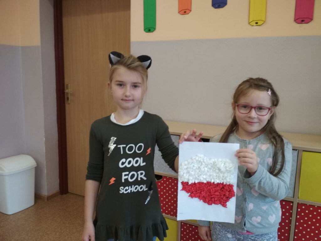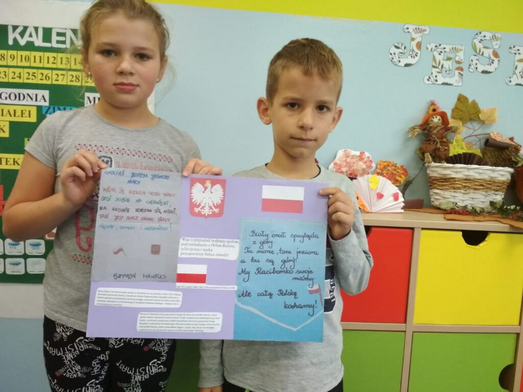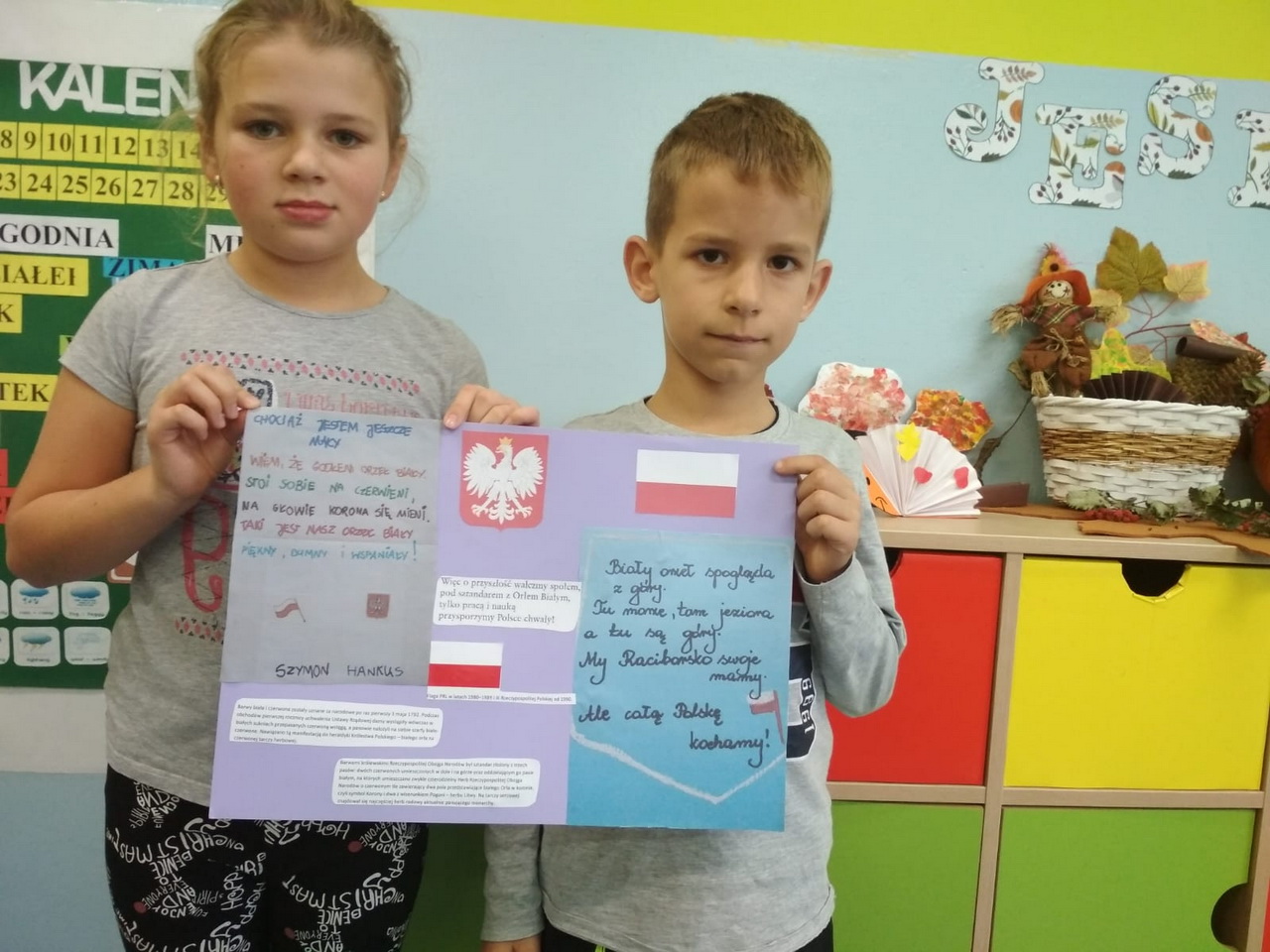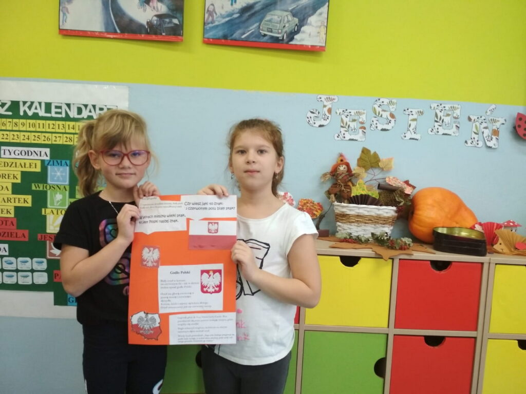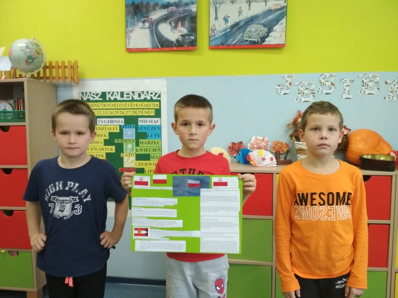 Święto Odzyskania Niepodległości wspominane było przez uczniów klas I-III od kilku tygodni. Wszyscy uczniowie doskonale znają i oddają szacunek  polskim symbolom narodowym. Potrafią zaśpiewać i znają historię HYMNU PAŃSTWOWEGO. Rozpoznają  BARWY NARODOWE i wiedzą co oznaczają. Poznali legendę ORŁA BIAŁEGO- symbolizującego nasze godło. Odnajdują na mapie  Wisłę, Bałtyk, polskie góry oraz największe miasta. Rozpoznają i nazywają zabytki Warszawy, Krakowa i Gniezna. Wiedzą kim był Józef Piłsudzki i jak świętowano Odzyskanie Niepodległości w tamtych czasach oraz włączają się w świętowanie 11 listopada w tym roku w swoich domach.