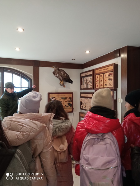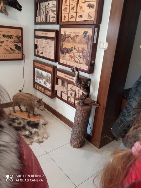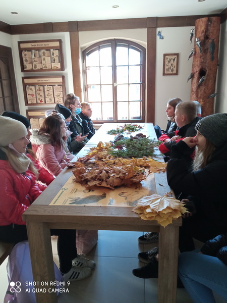 Następnym punktem warsztatów była wizyta w Izbie Przyrodniczo-Leśnej. Obejrzeliśmy tam bardzo ciekawą wystawę, dotyczącą poszczególnych grup roślin i zwierząt, występujących na terenie nadleśnictwa opartą o ciekawe informacje przekazane nam przez naszego edukatora.