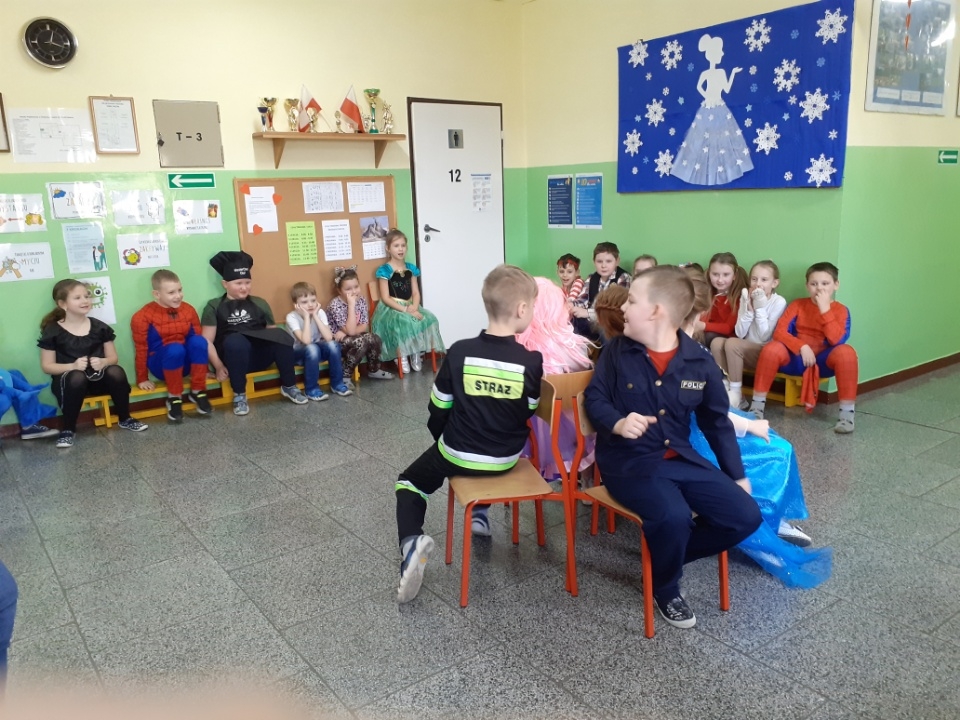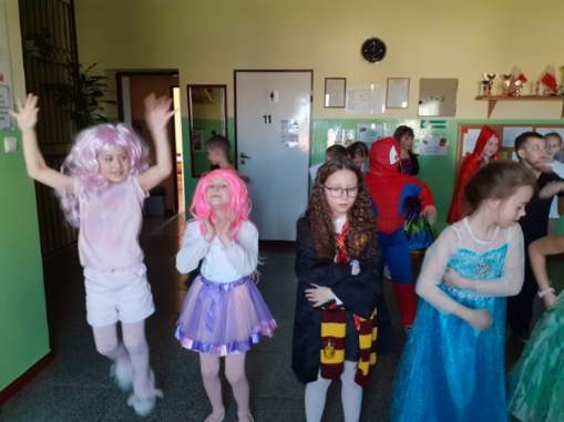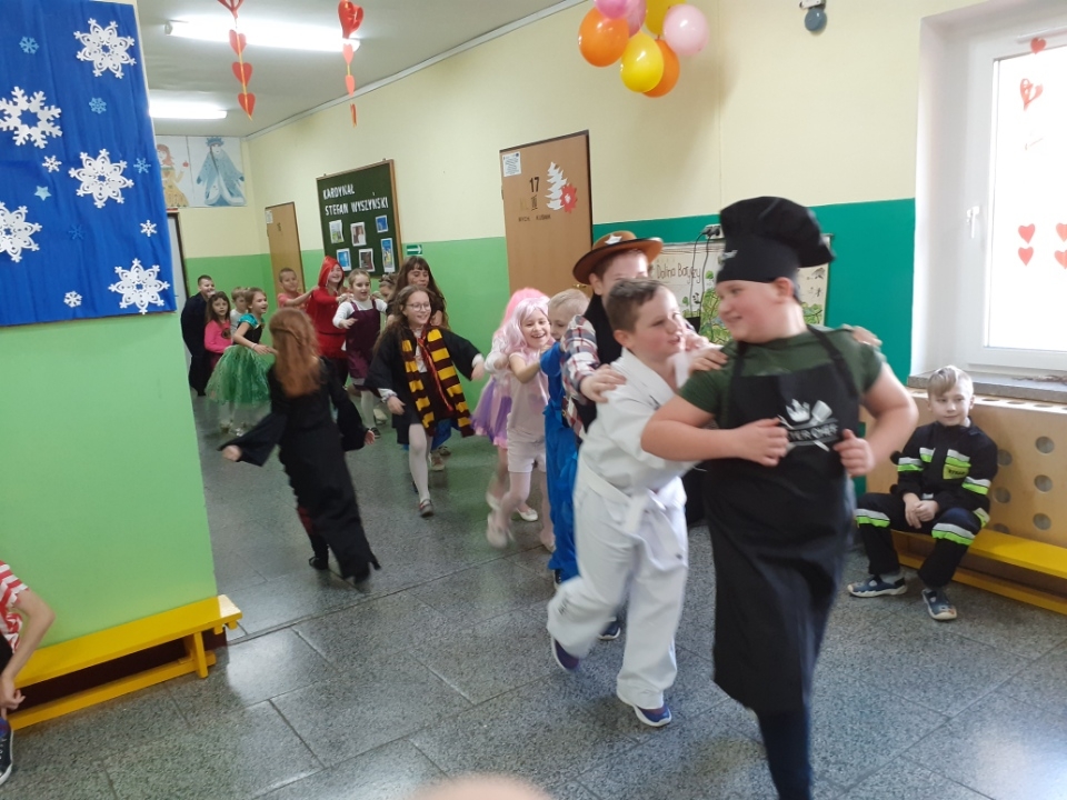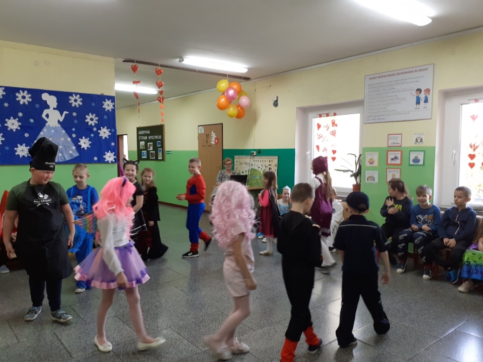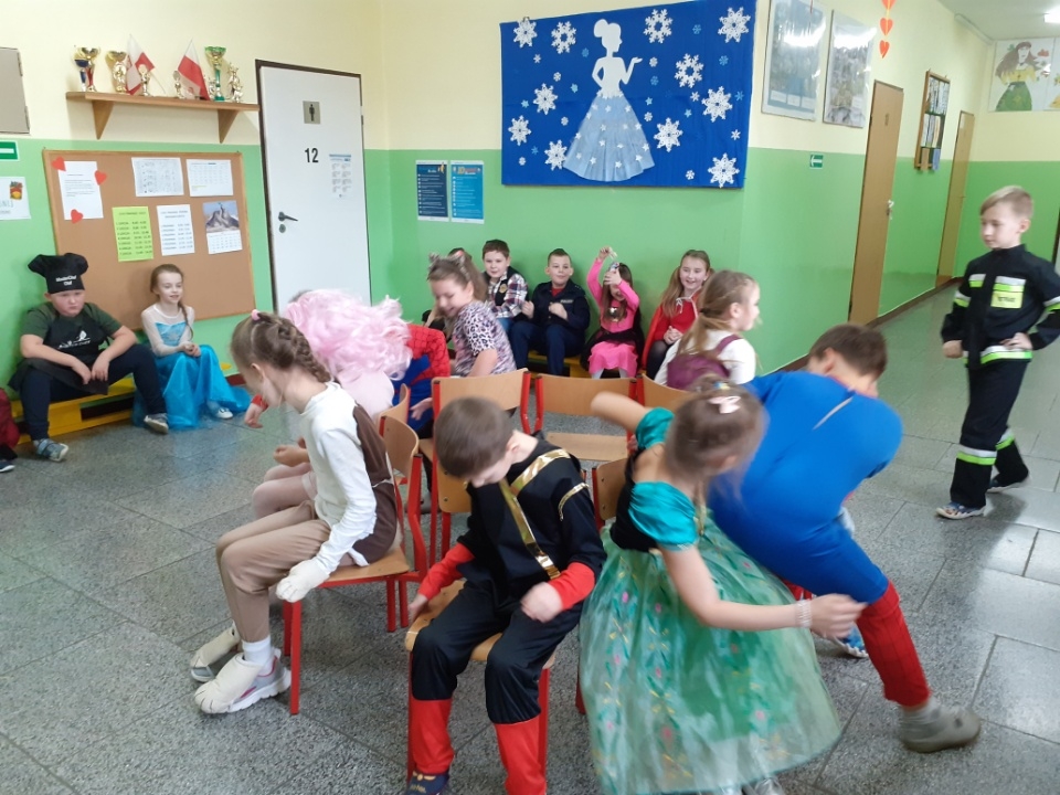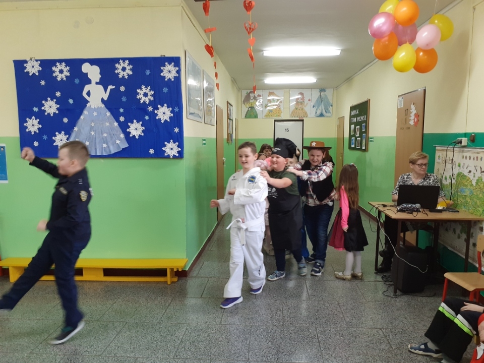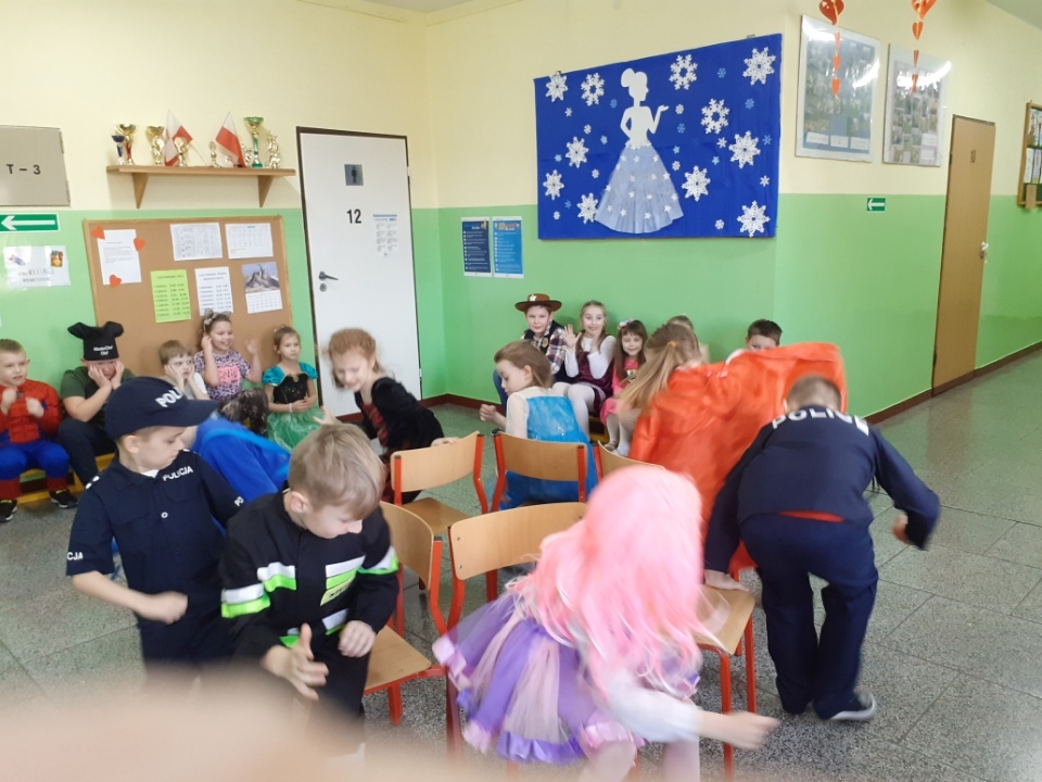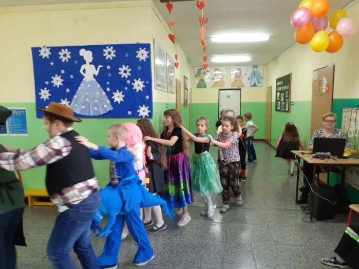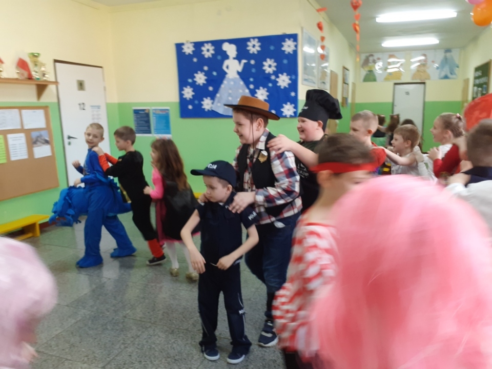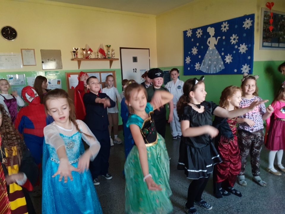 Tańce, pląsy, konkursy, radość i zadowolenie podczas zabawy karnawałowej w klasach I-III.