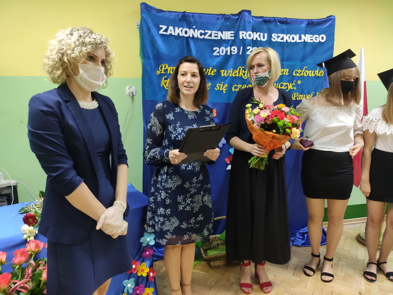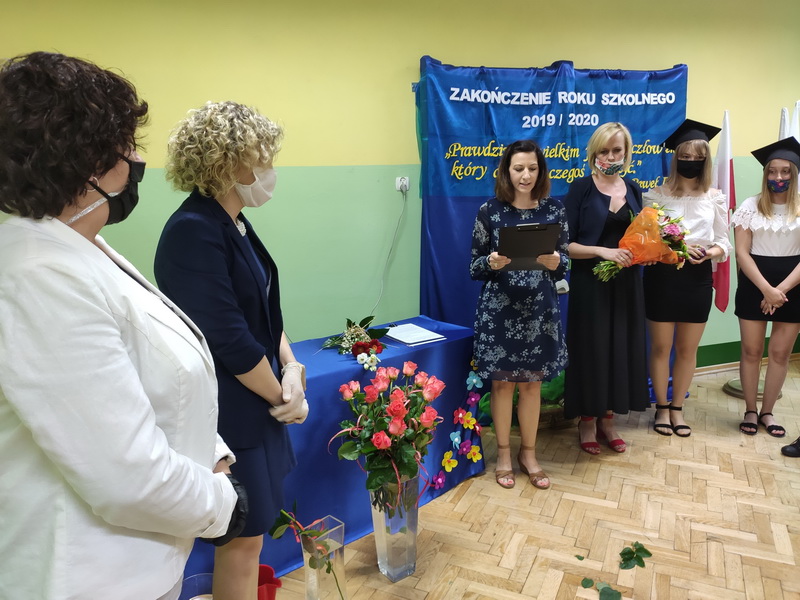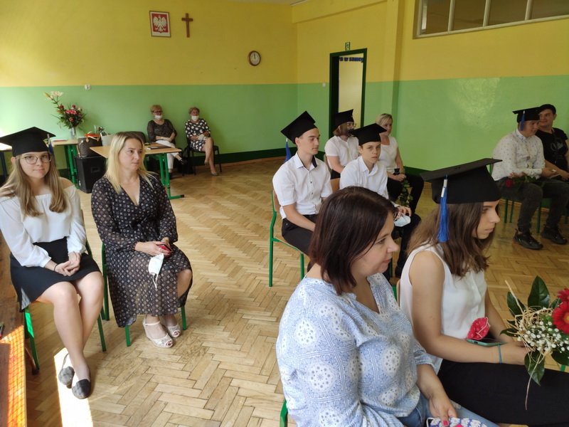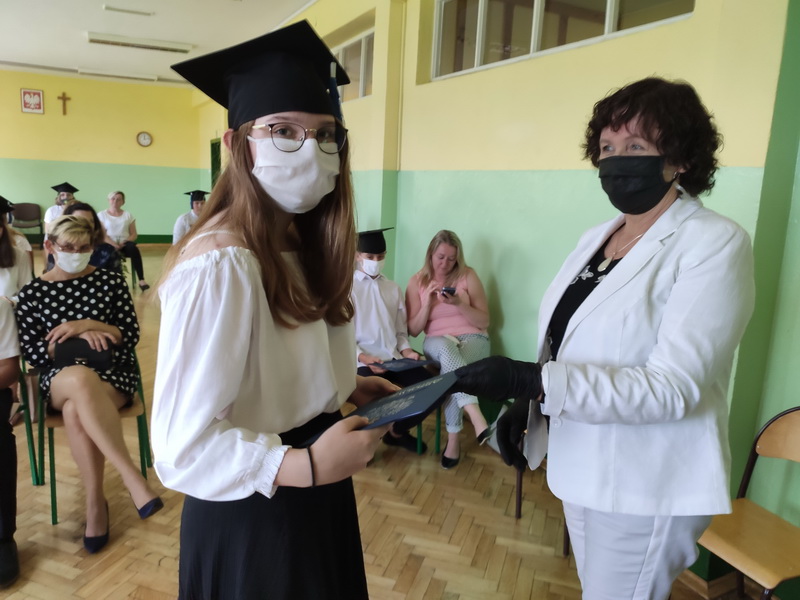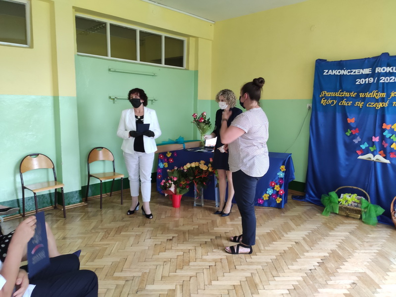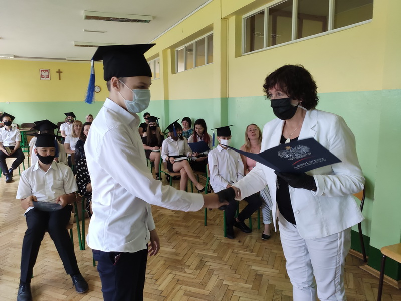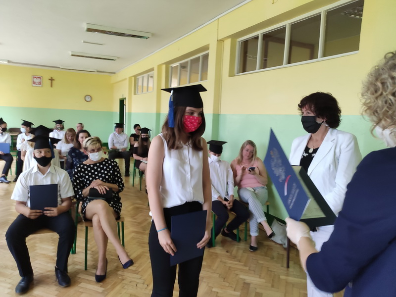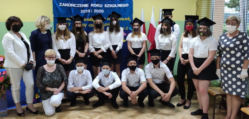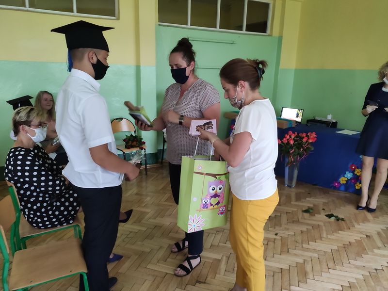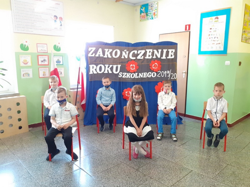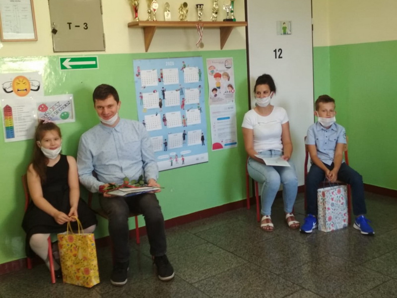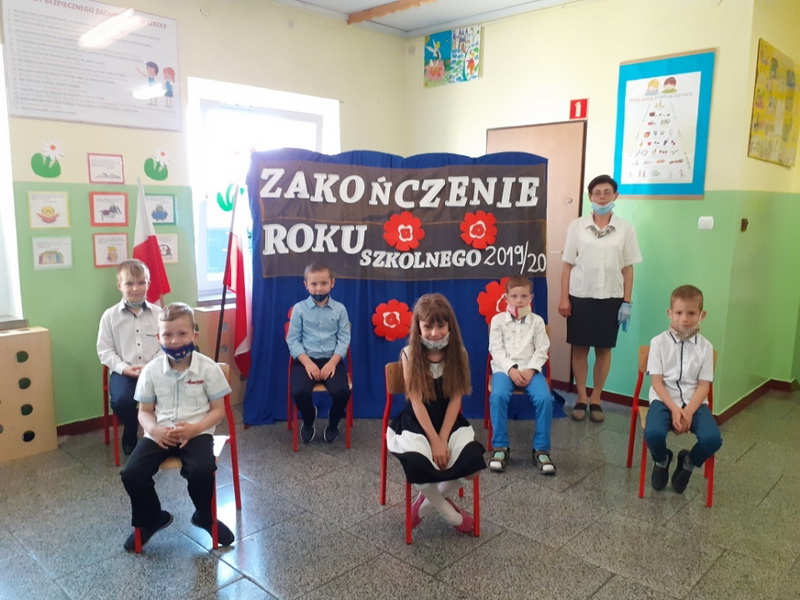 Zakończenie roku szkolnego 2019/2020 przebiegało w nietypowy sposób. W związku z panującą epidemią Covid 19 wręczenie świadectw uczniom klas I-VII odbyło się o wyznaczonych godzinach z zachowaniem odległości, w maseczkach. Podczas spotkań wychowawcy podsumowali wyniki w nauce – wręczyli świadectwa, nagrody oraz przypomnieli uczniom o zasadach bezpieczeństwa podczas wakacji. Skromną uroczystością w szkole pożegnano uczniów klasy VIII.